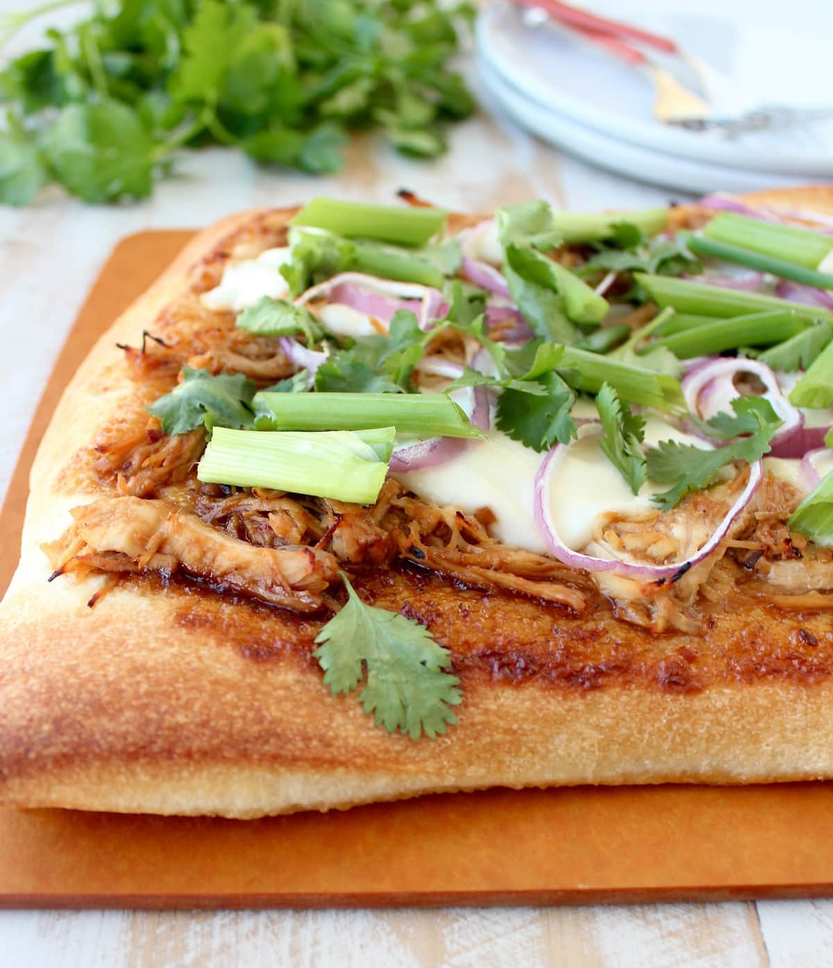Homemade Korean BBQ sauce is tossed with shredded chicken & topped with fresh mozzarella, cilantro, green & red onions in this scrumptious pizza recipe!