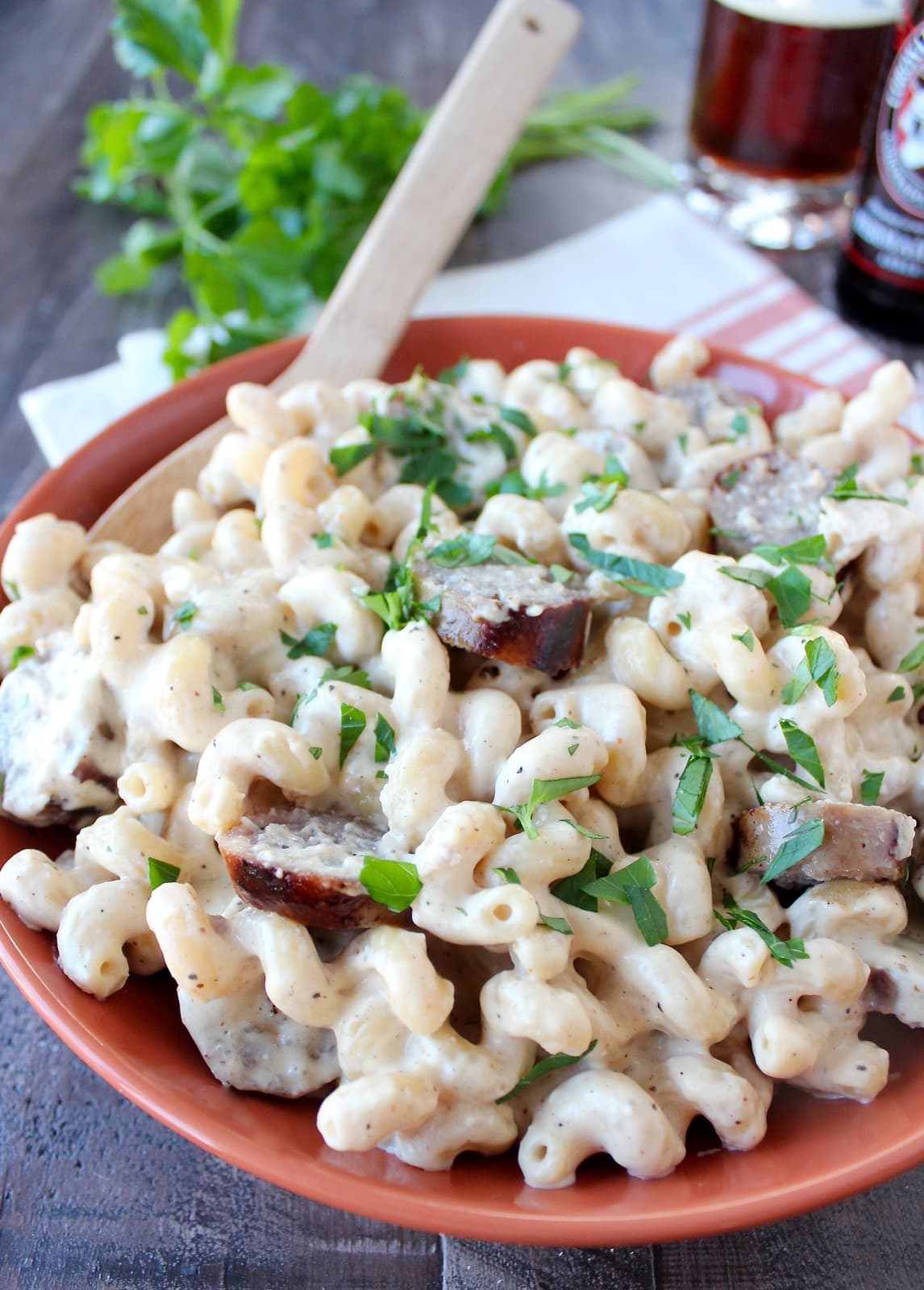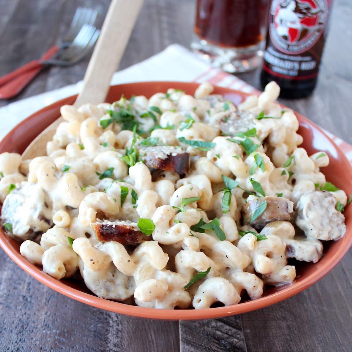 This Mac and Cheese Recipe is kicked up a notch with the addition of grilled bratwurst and amber beer, putting a fun and flavorful twist on mac and cheese!