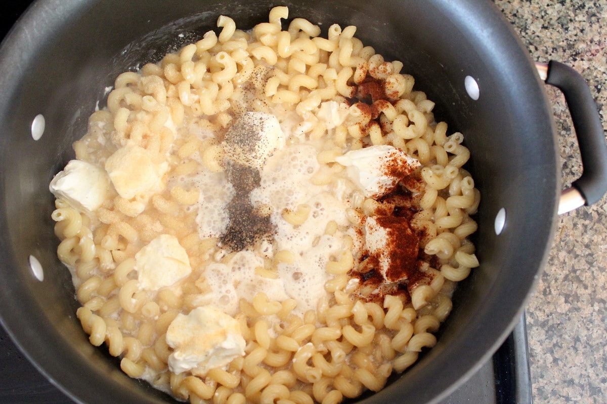 Add the cream cheese, amber beer, milk, garlic powder, black pepper and kosher salt.
