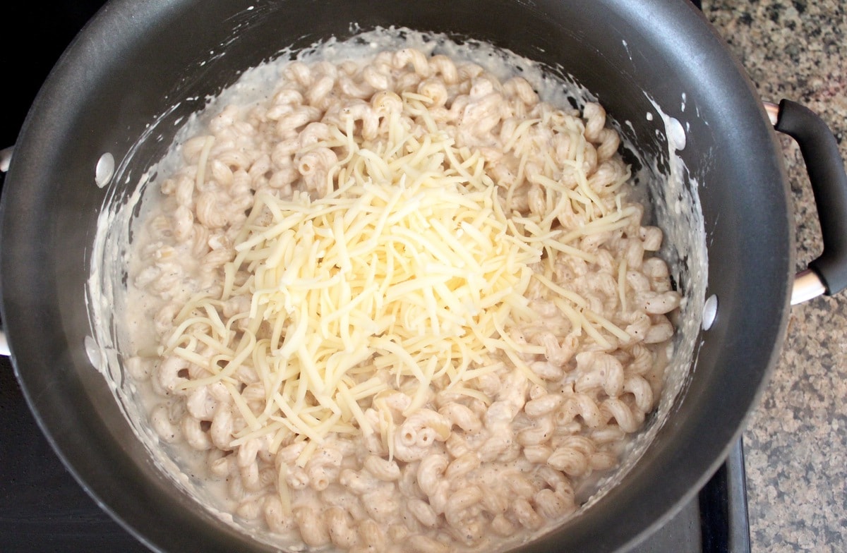 Boil a large pot of water and cook the macaroni noodles according to package directions. Drain the noodles, then return them to the pot.