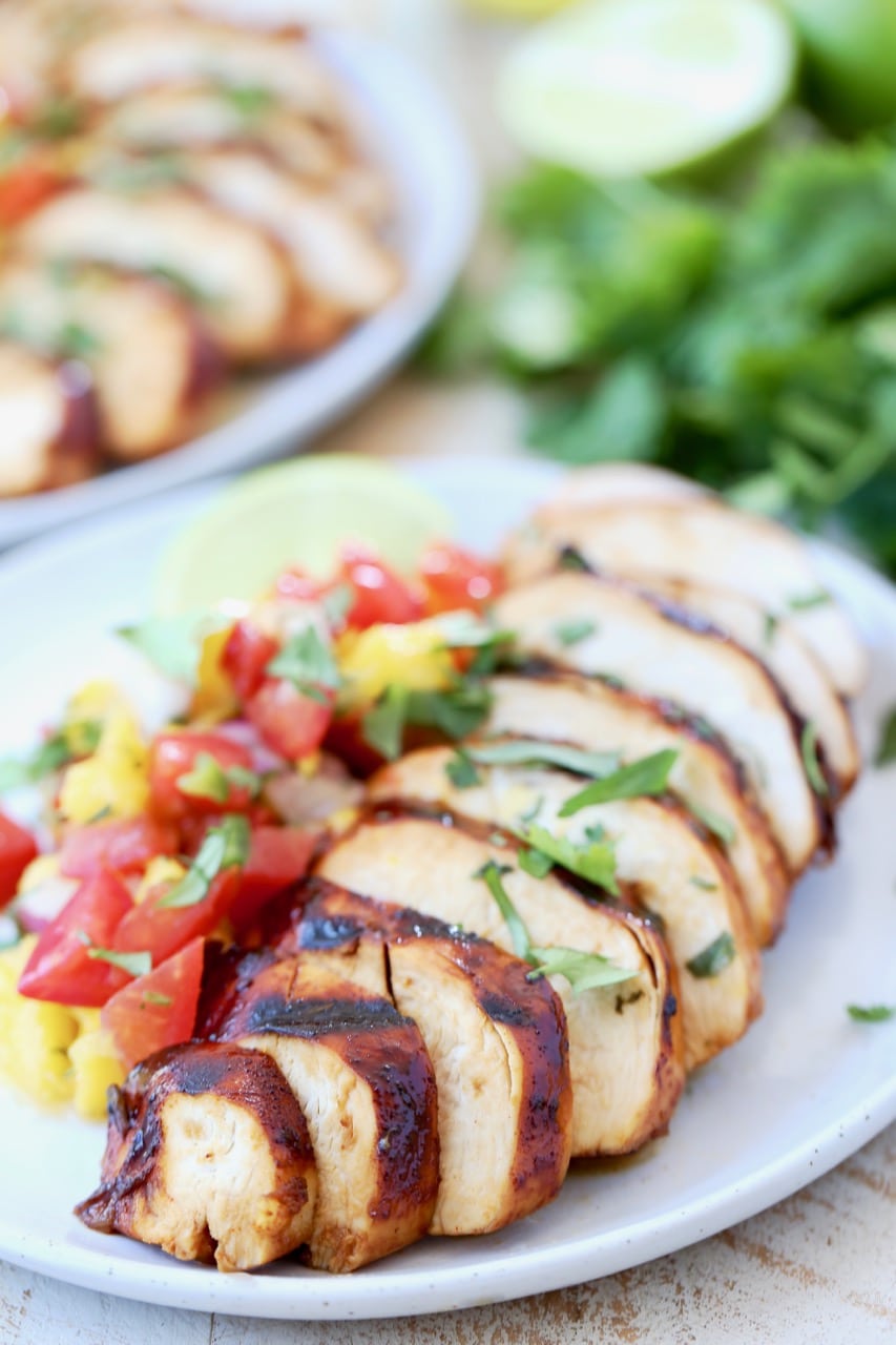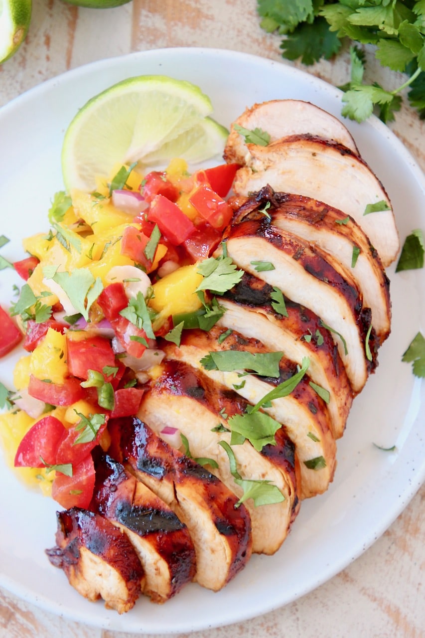 Remove from the grill, slice and top with the mango salsa for a delicious dinner!