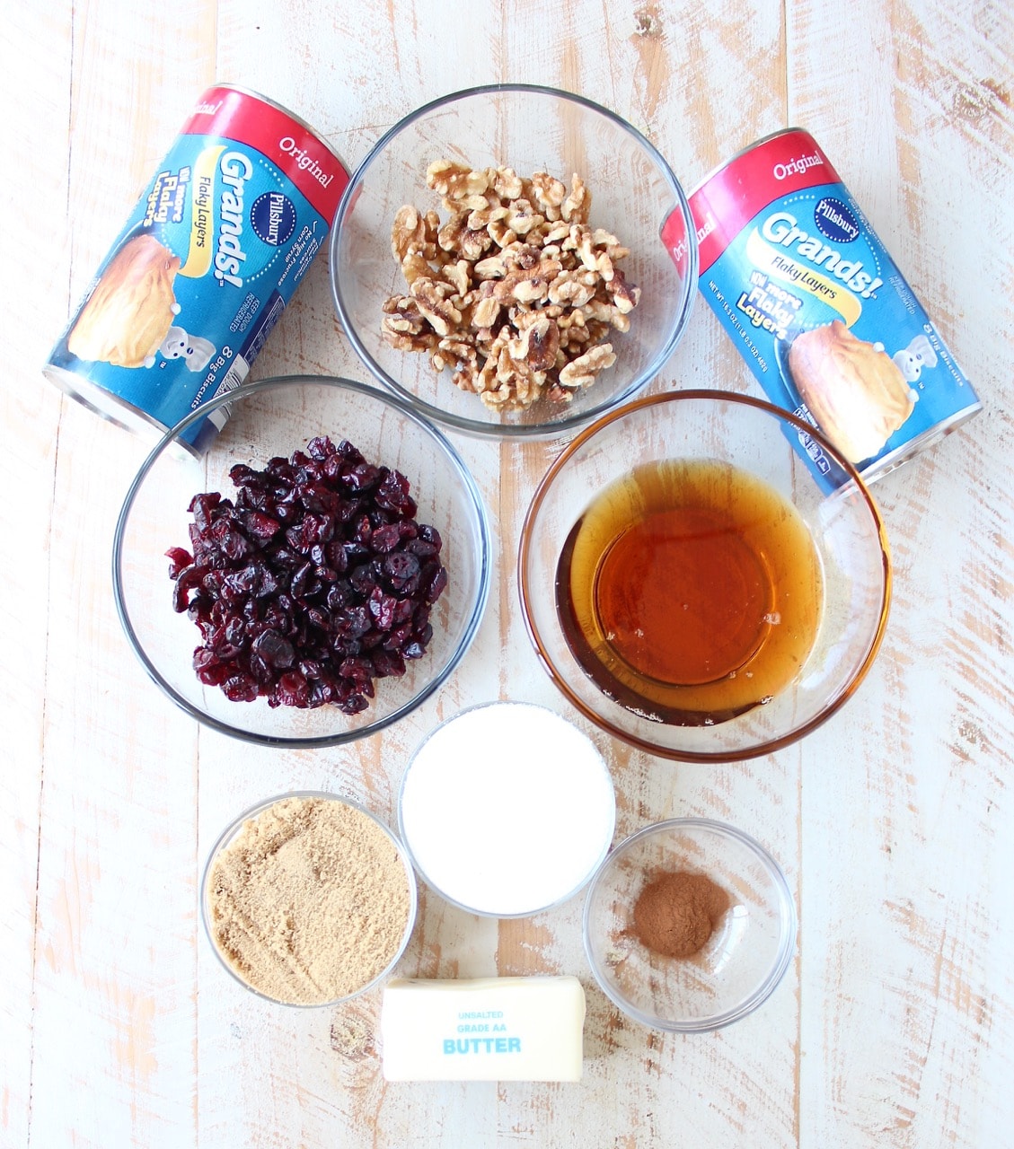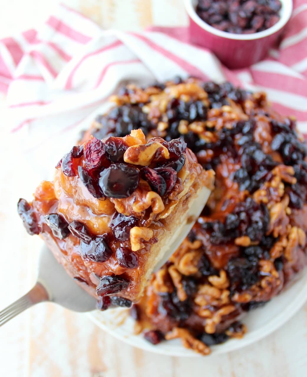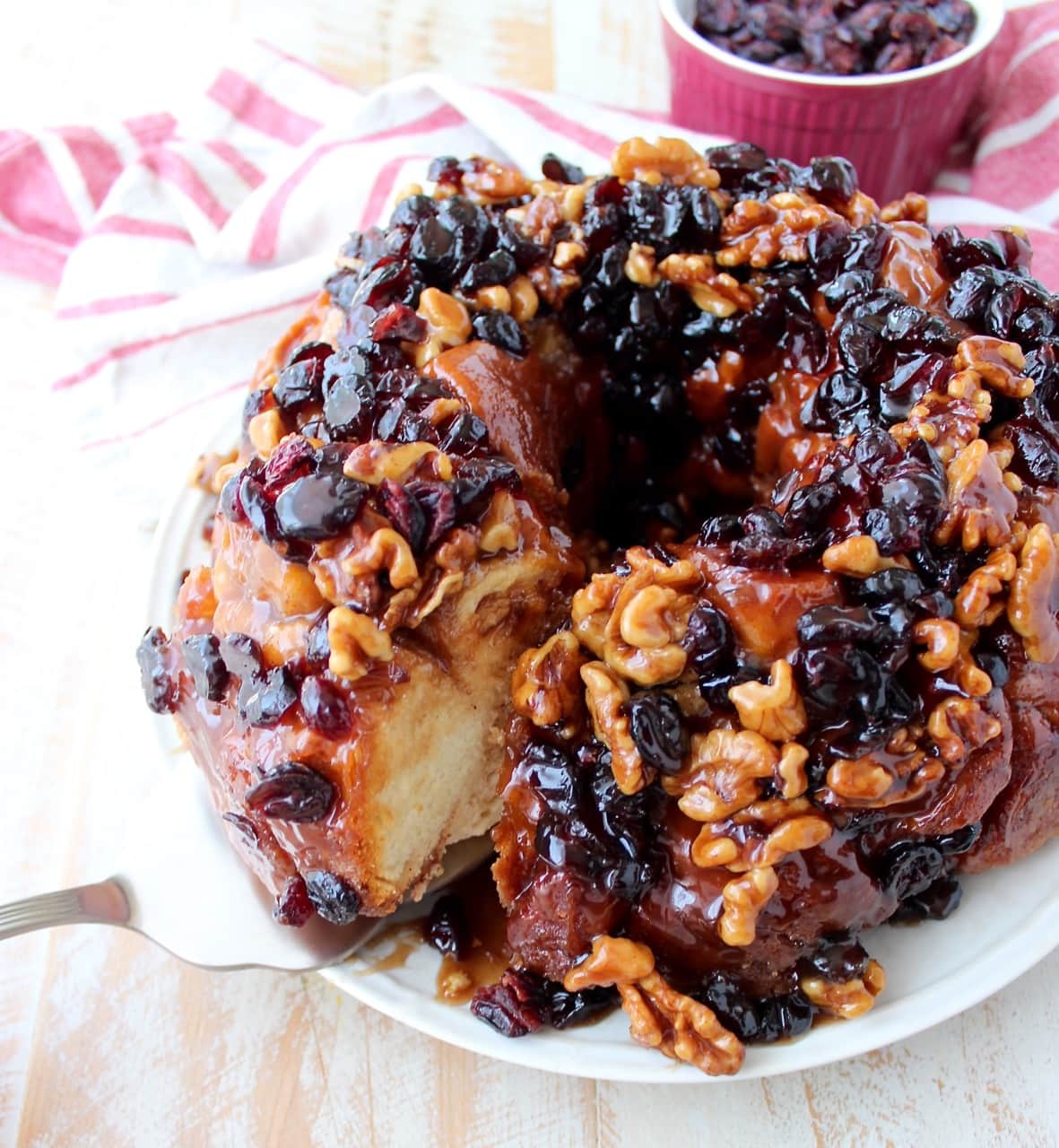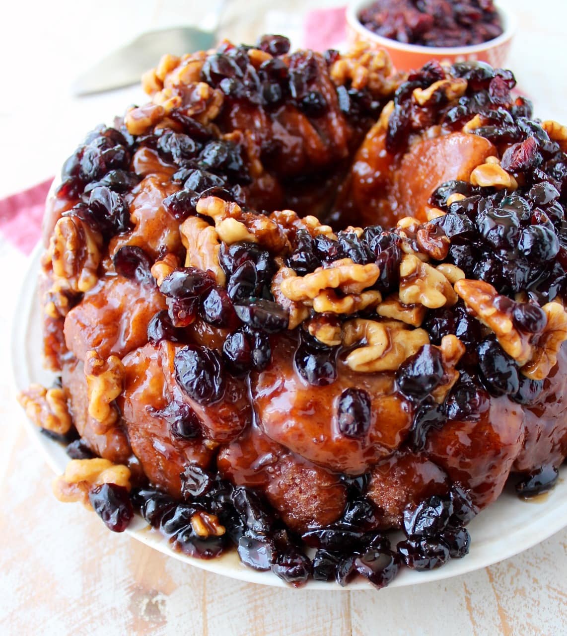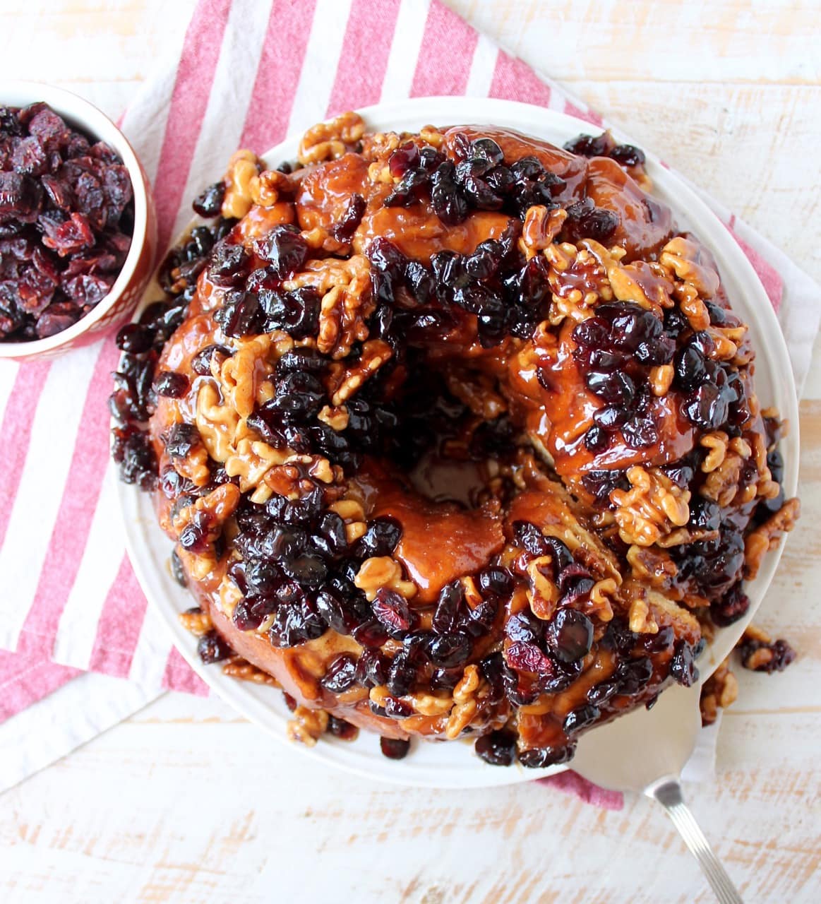 Maple syrup, dried cranberries and walnuts top this decadent monkey bread recipe that’s perfect for fall brunches and holiday breakfasts!