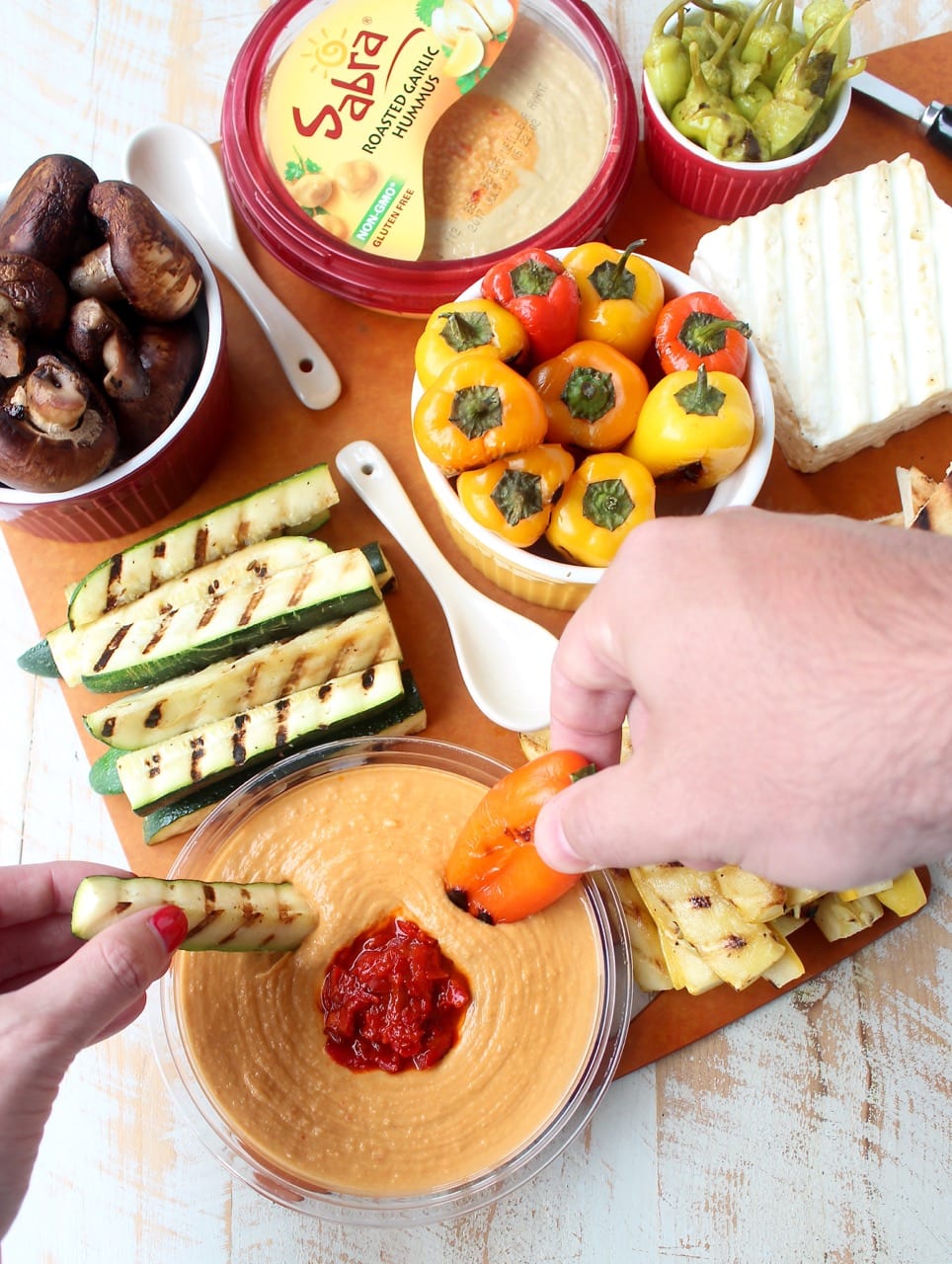 - Remove everything from the grill and arrange on a large cutting board with the Sabra Roasted Red Pepper and Roasted Garlic Hummus.