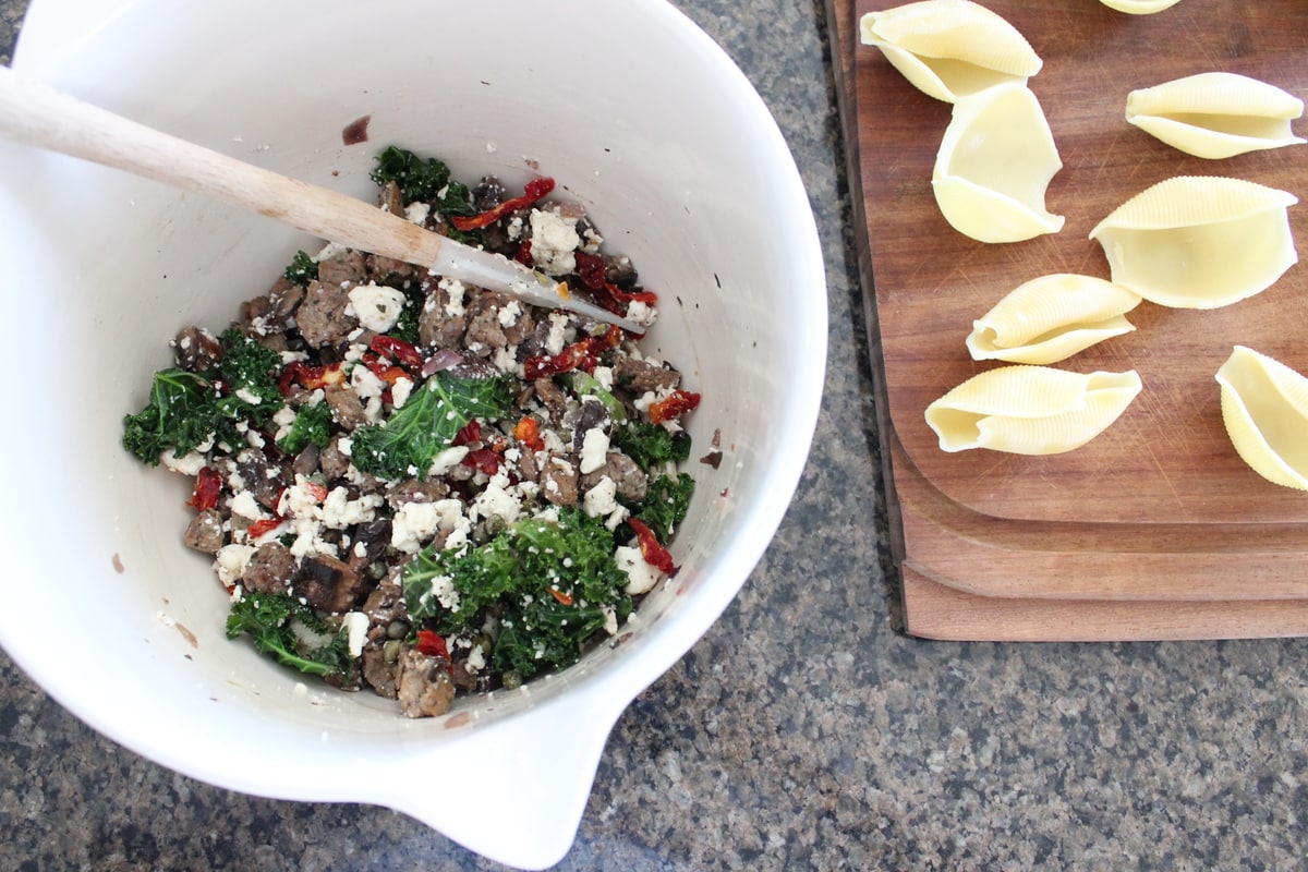 - Spoon the sausage, kale, mushroom mixture into the shells.
