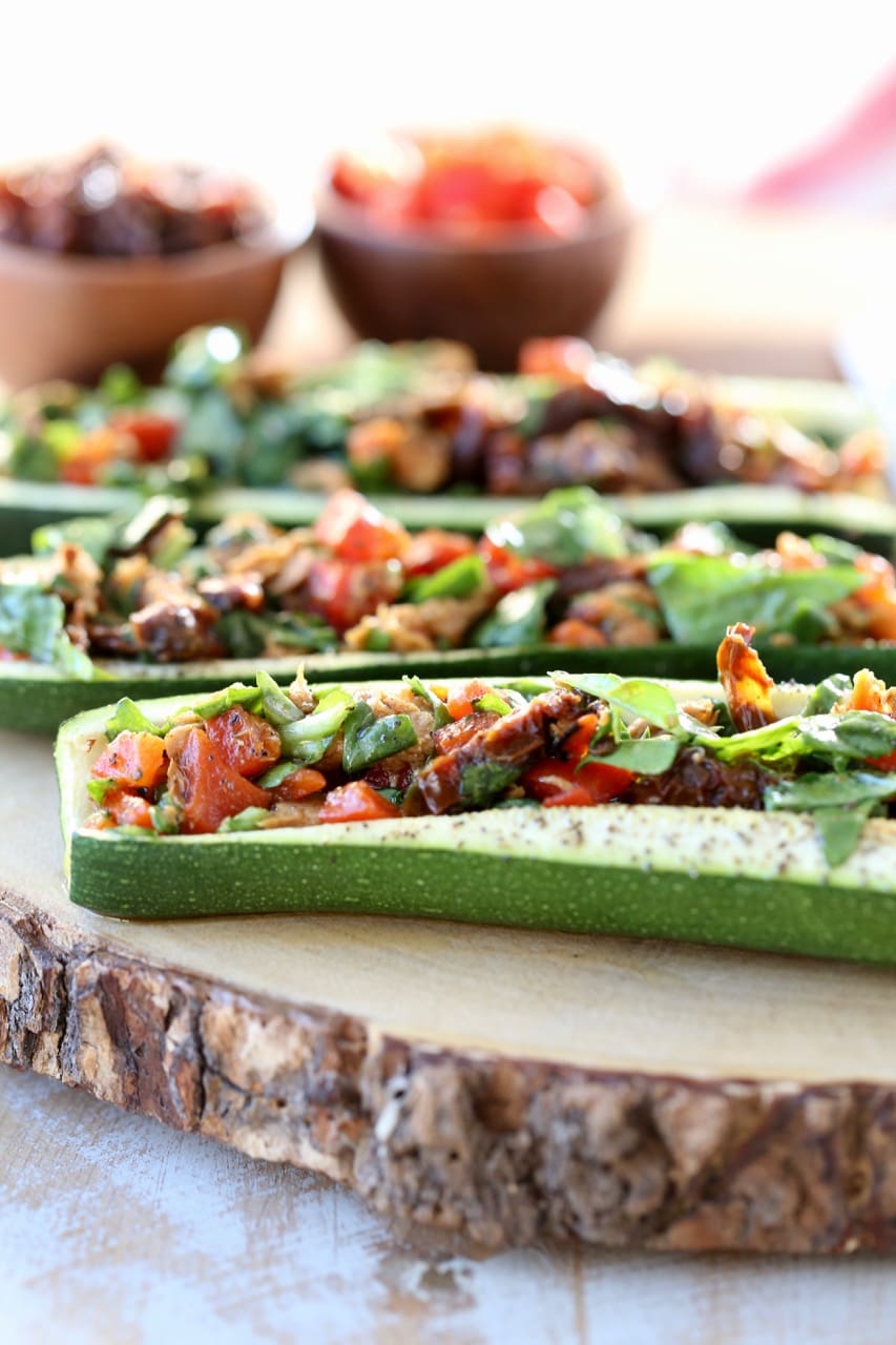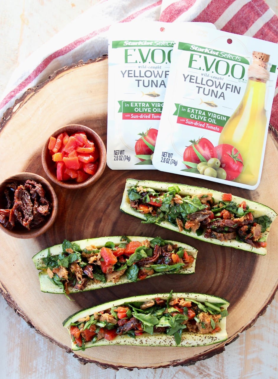 Zucchini Boats are one of my go-to healthy dinner options, made in under 30 minutes! You can fill the zucchini with buffalo chicken, Greek spiced ground turkey or delicious StarKist Selects E.V.O.O.™ Yellowfin Tuna with Sun Dried Tomatoes.