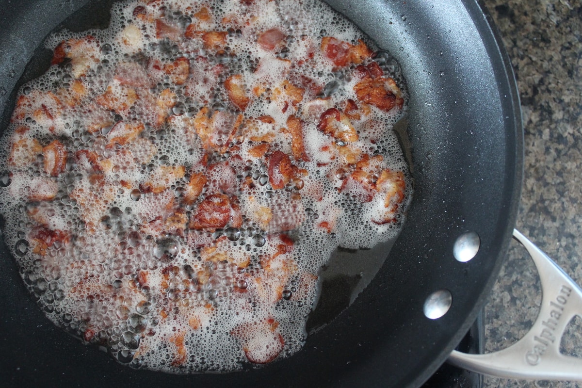 - Add the chopped bacon to a large pan over medium-high heat, cook for 4-5 minutes, or until crisp.