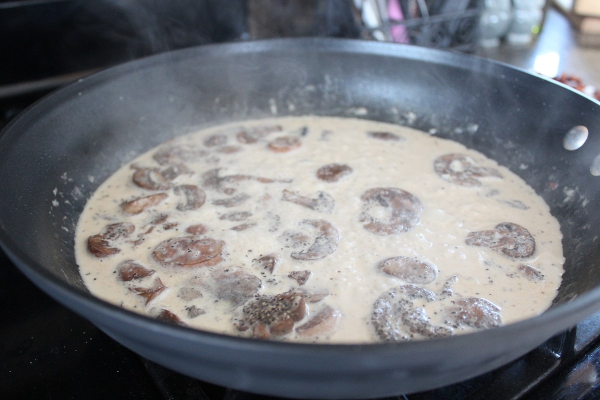 - Add the chicken broth and heavy cream.