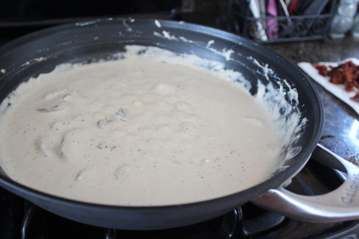 - Add the cream cheese and whisk together until a creamy sauce forms, then add the parmesan cheese.