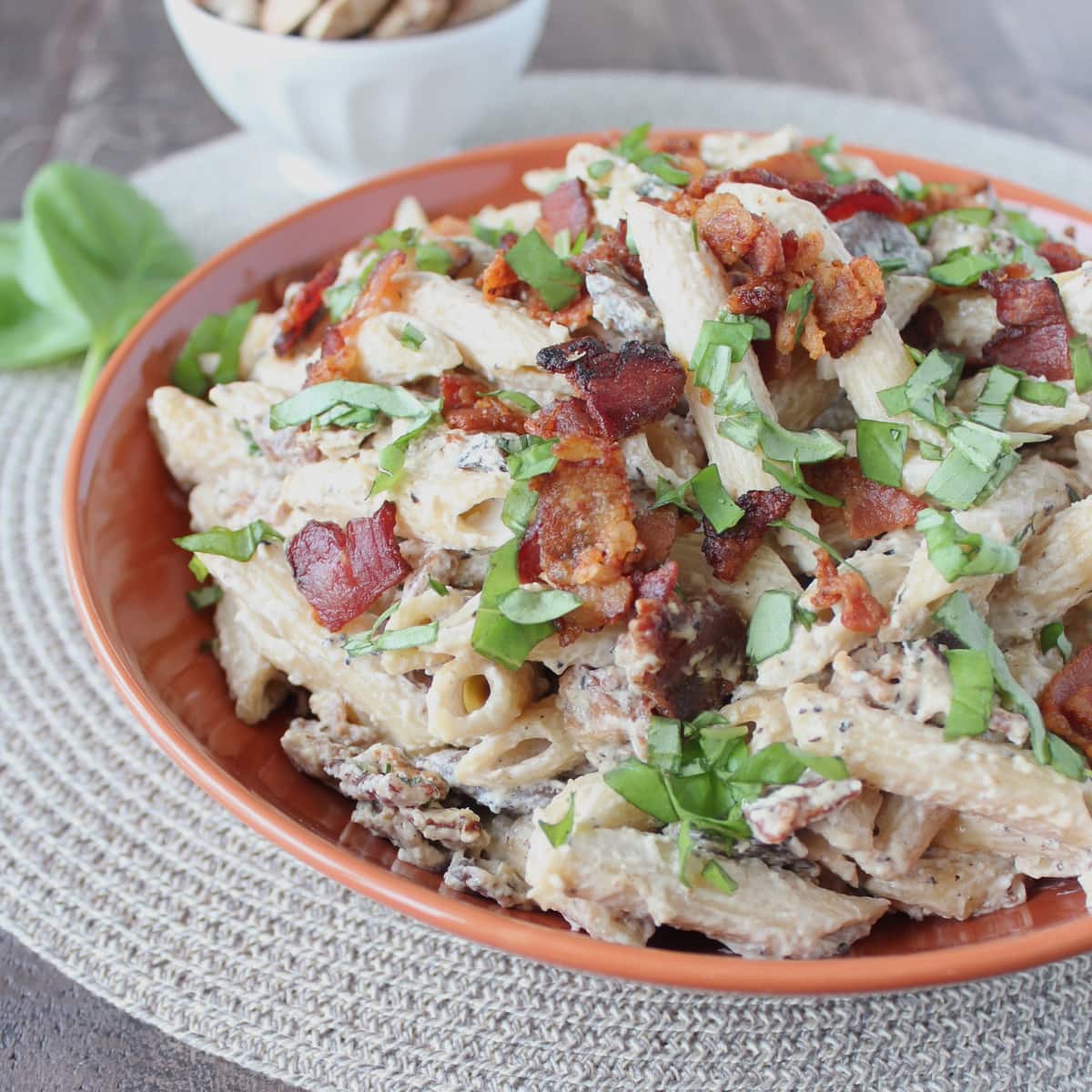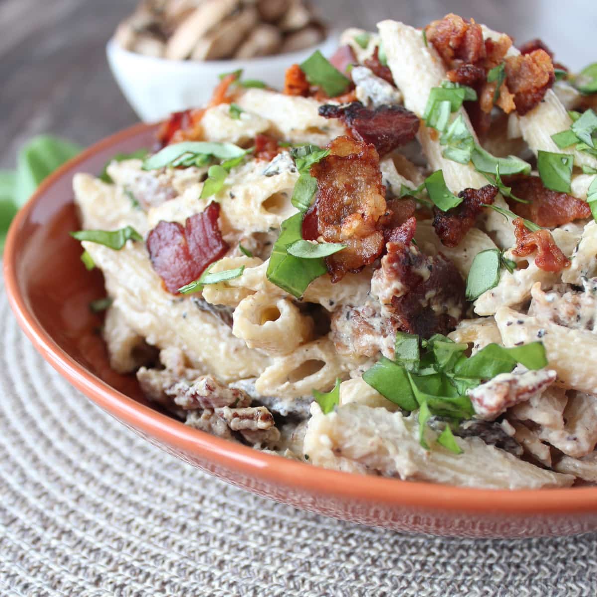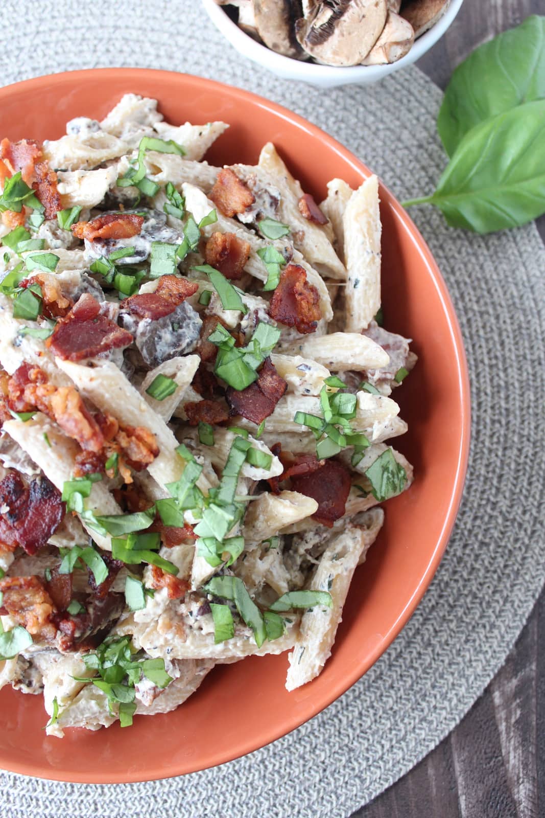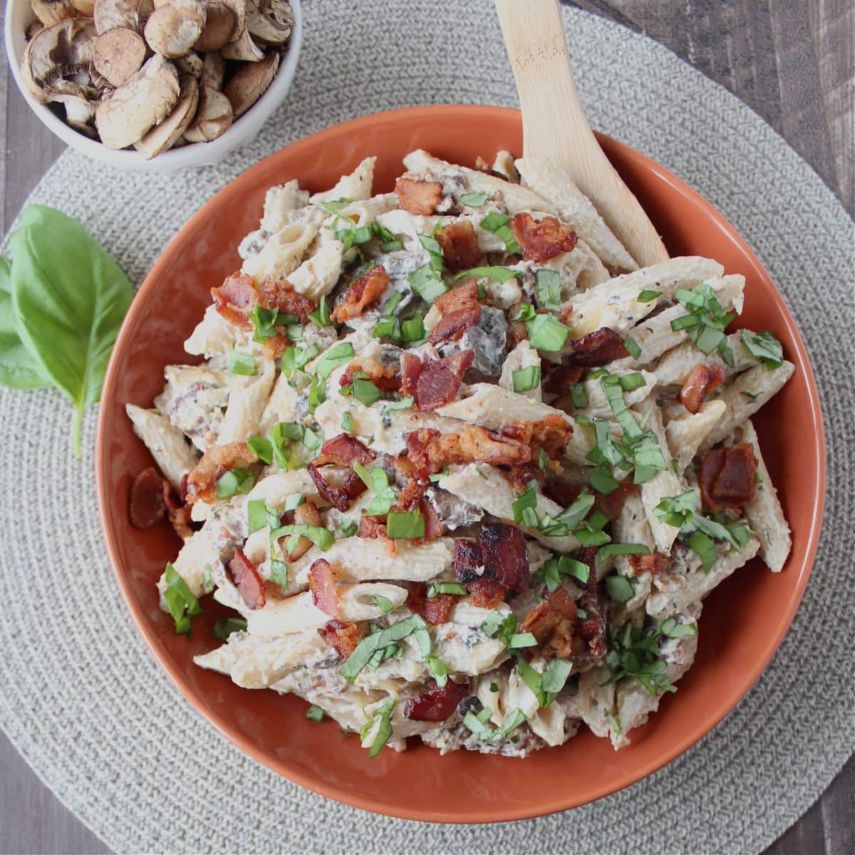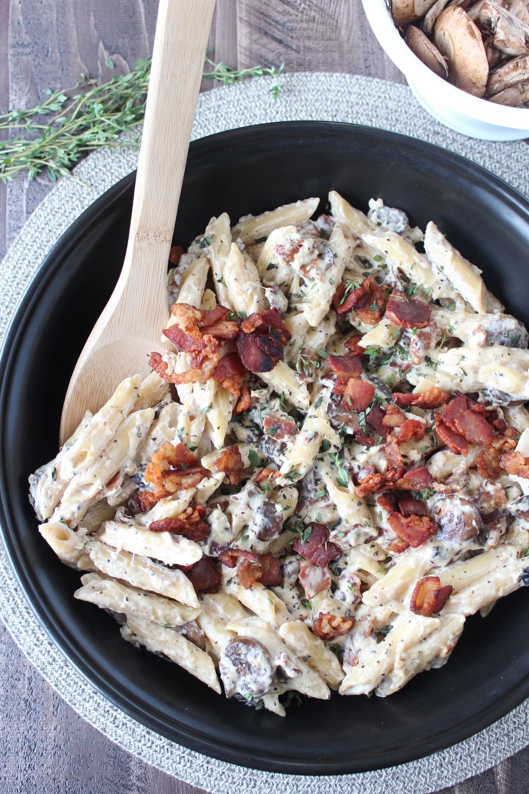 This dish combines penne pasta with a creamy, cheesy mushroom sauce, topped with crispy bacon for a rich, hearty, mouth-watering meal!