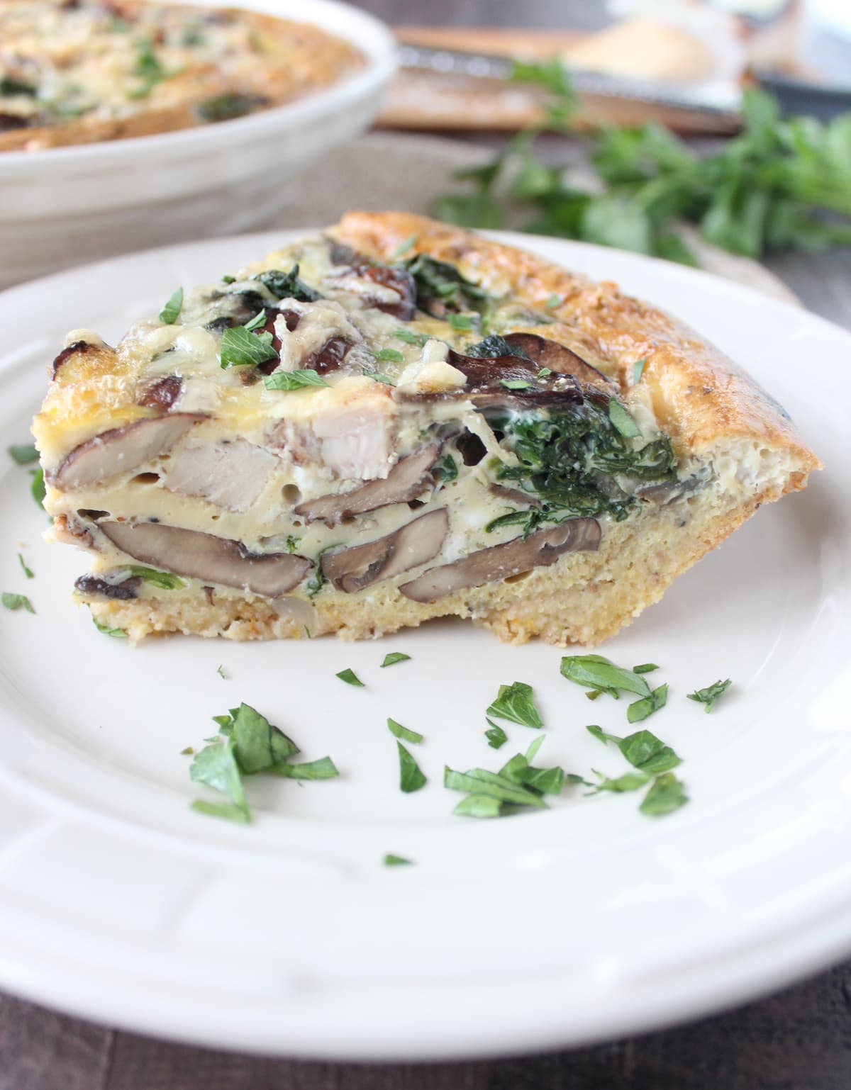 I used leftover Gluten Free Cornbread Stuffing for the crust, then filled it up with leftover diced Garlic Herb Bacon Wrapped Turkey. I added fresh mushrooms and spinach to fill up this delicious quiche!
