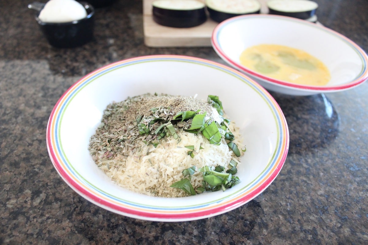 - In another shallow bowl, combine the oregano, thyme, basil, salt, pepper, breadcrumbs and parmesan cheese.