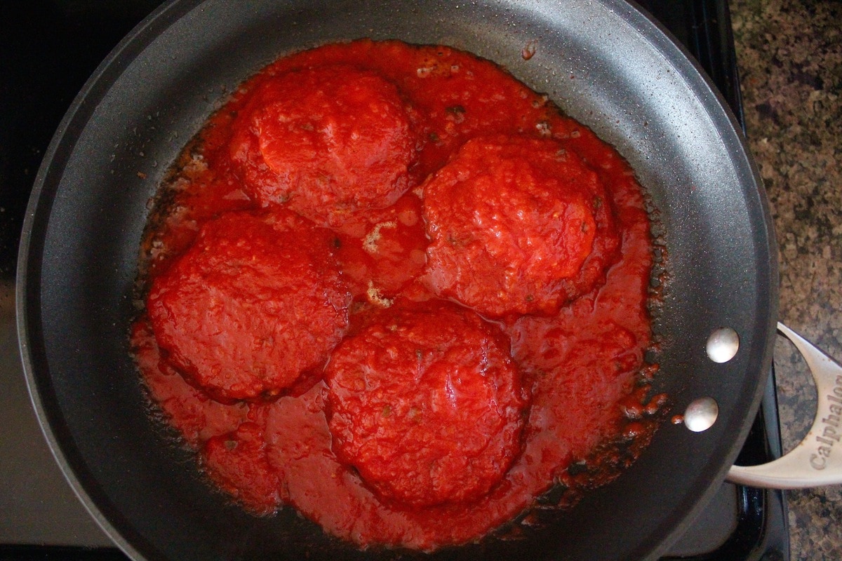 - Reduce heat to low and cover the eggplant with the marinara sauce.