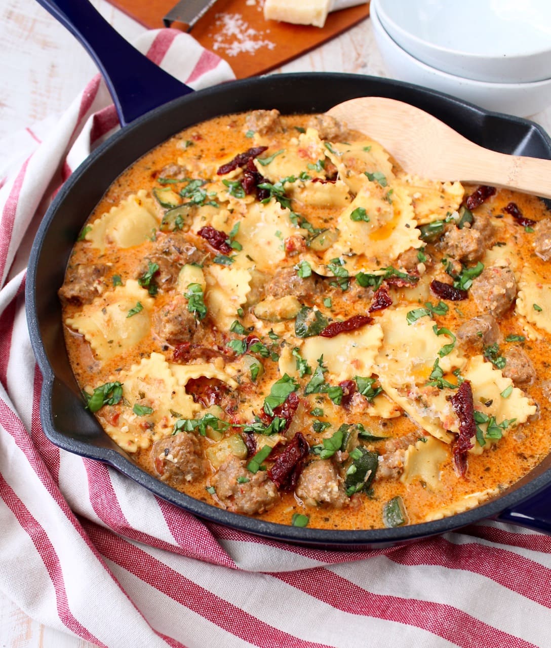 One Pot Pasta Sausage Pesto & Cheese Ravioli