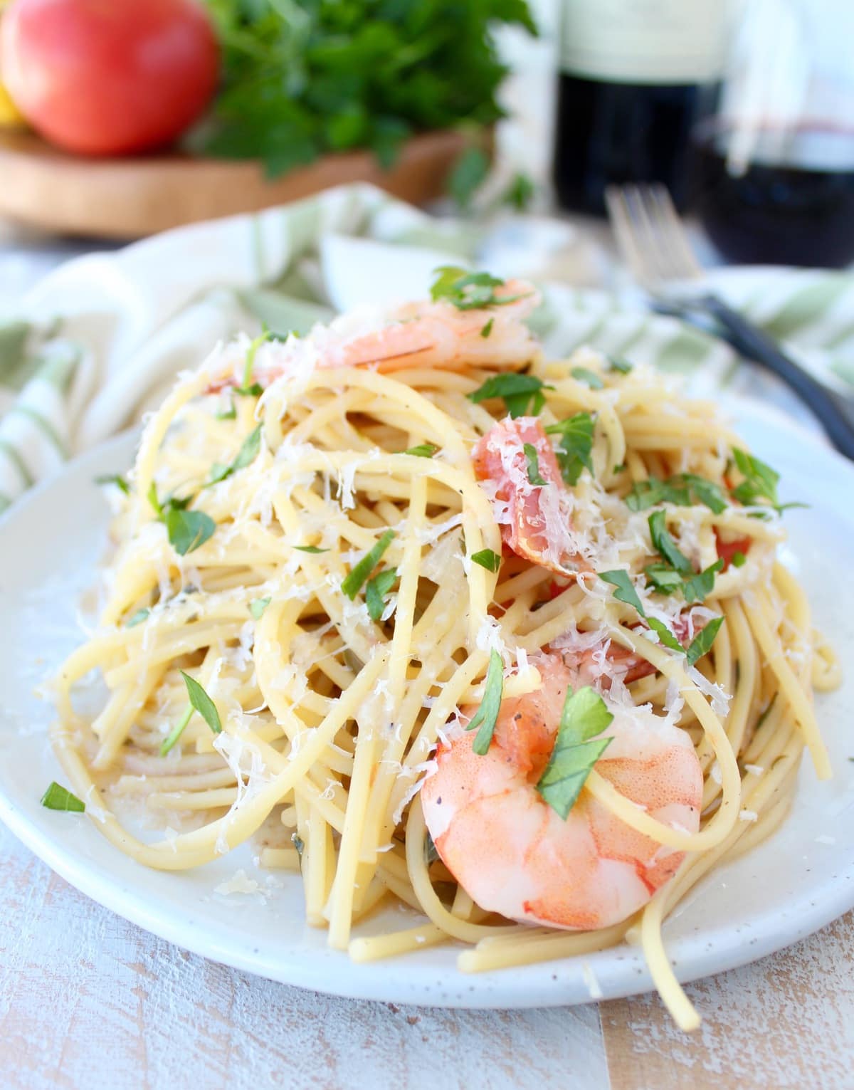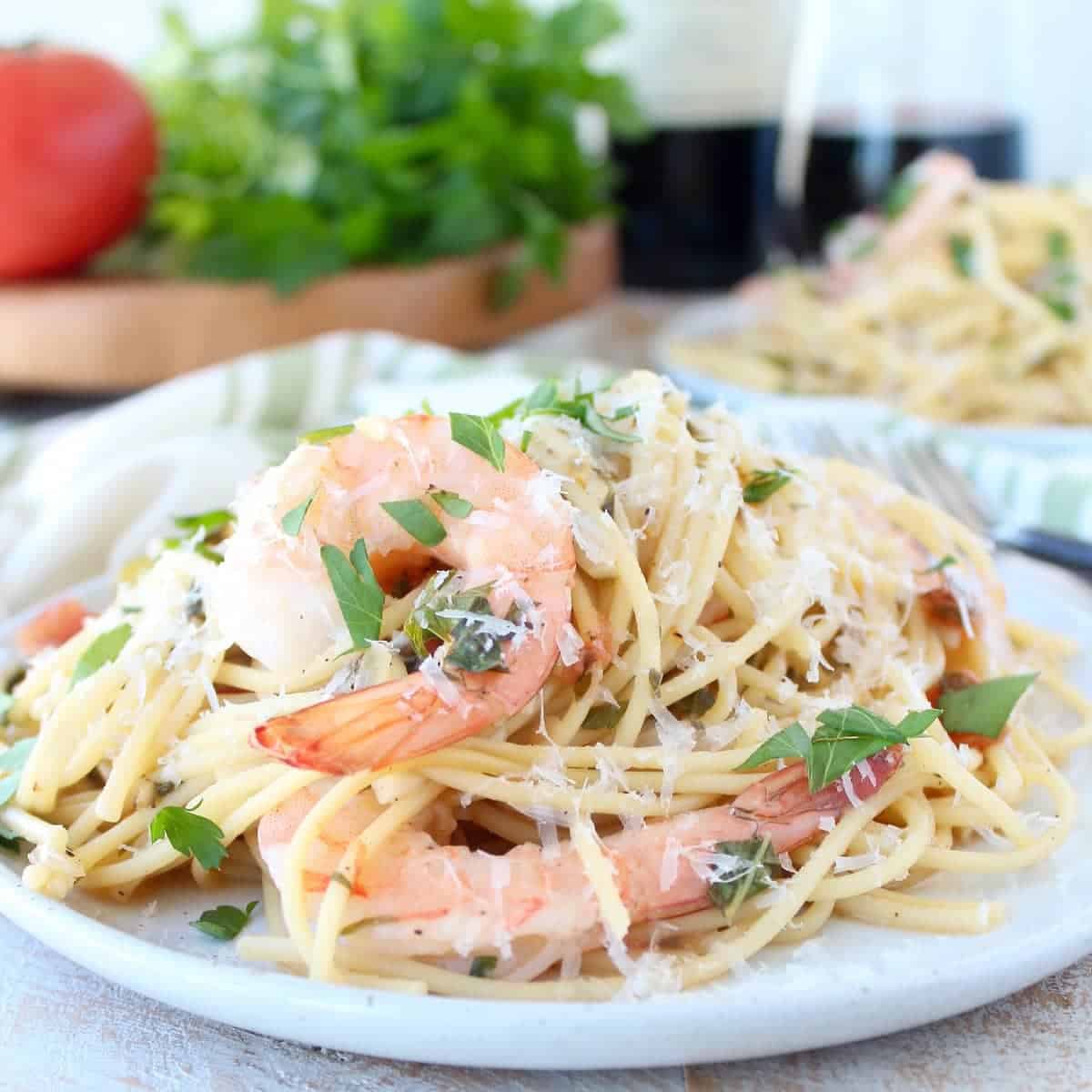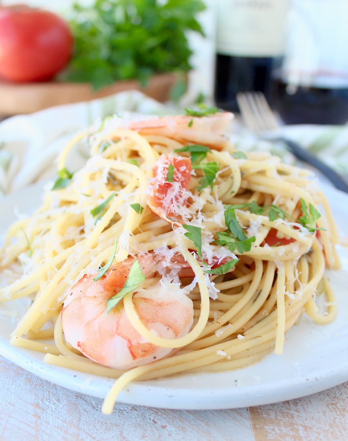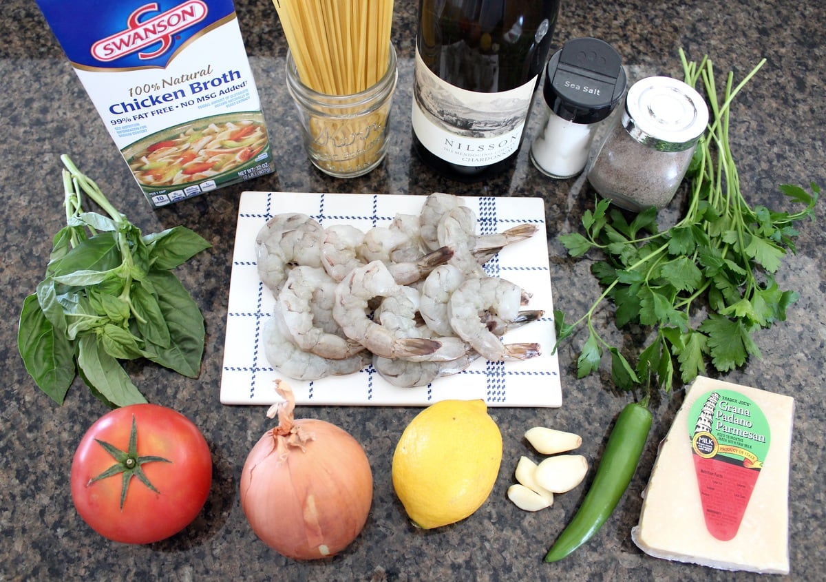 Olive oil, garlic, lemon, tomatoes, and salt are staple ingredients in the region. Add these ingredients to pasta cooked in white wine with shrimp and you have one seriously flavorful dish made with simple, delicious ingredients!