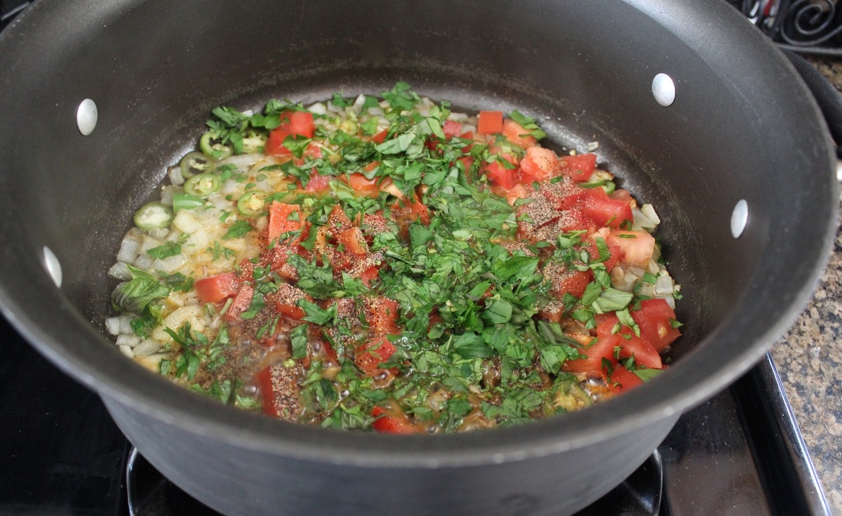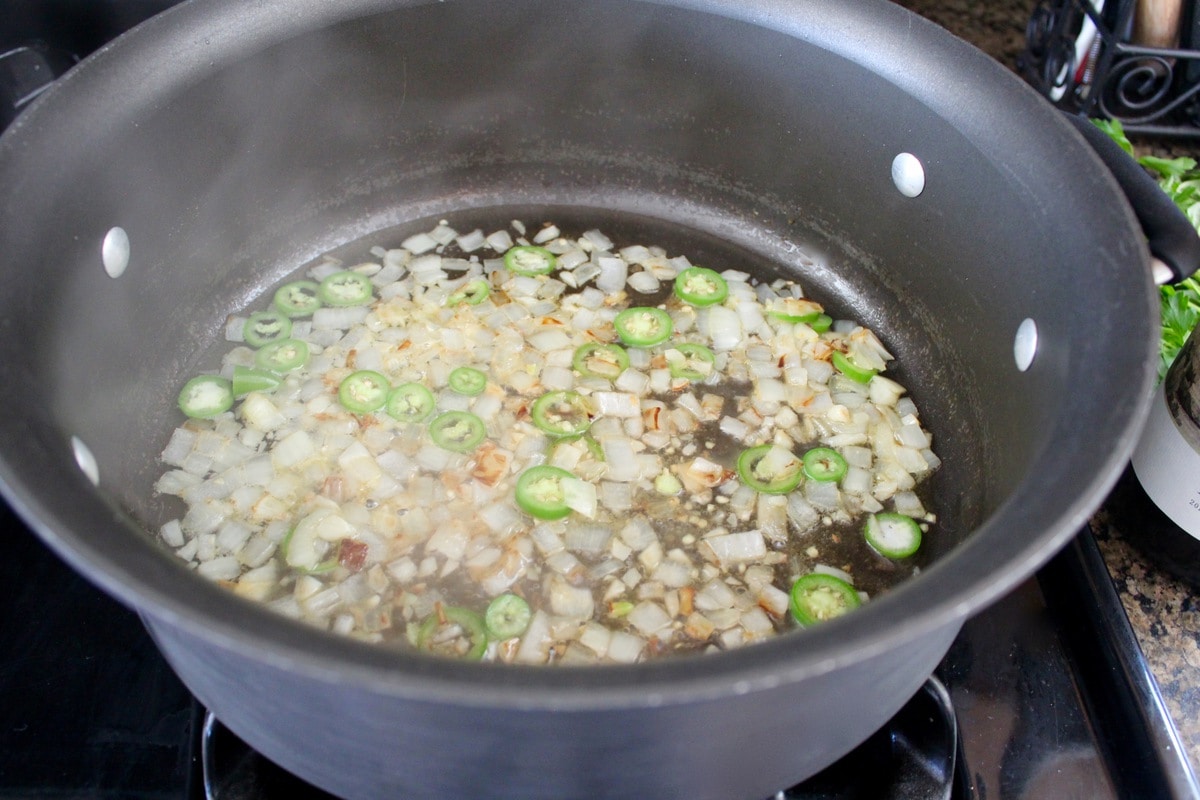 Add the olive oil to a large pot or dutch oven over medium heat. Once the oil is hot, add the onion, saute 4-5 minutes. Add the garlic and serrano chile, saute for an additional 1-2 minutes, then add the white wine.
