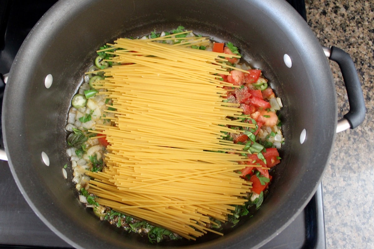 - Break the spaghetti noodles in half, then add to the pot.