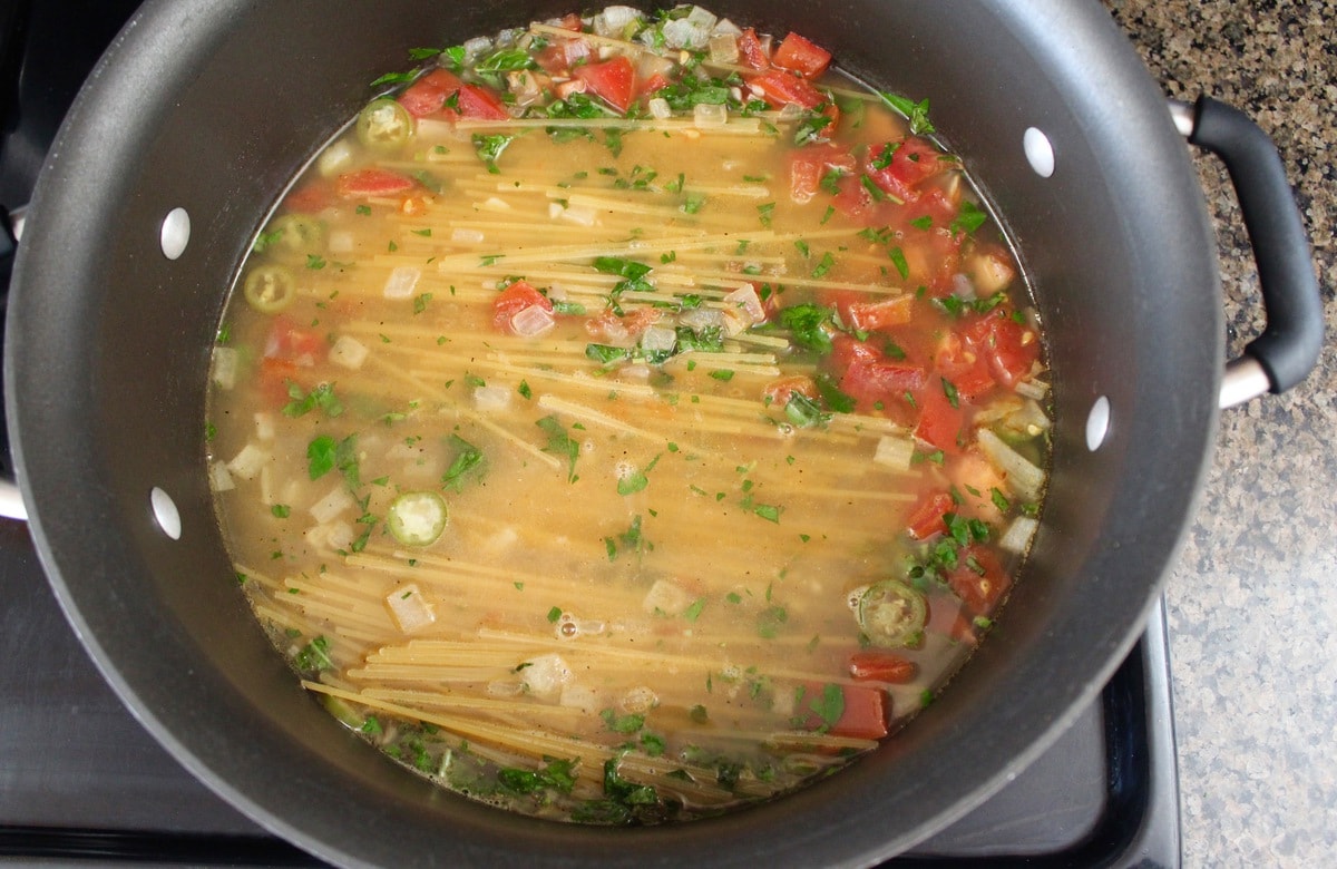 Pour the chicken broth over the noodles. Mix everything together and bring to a boil.