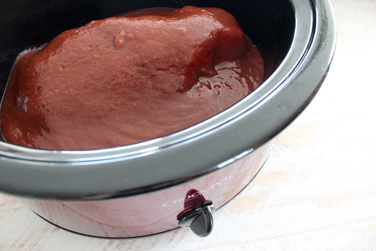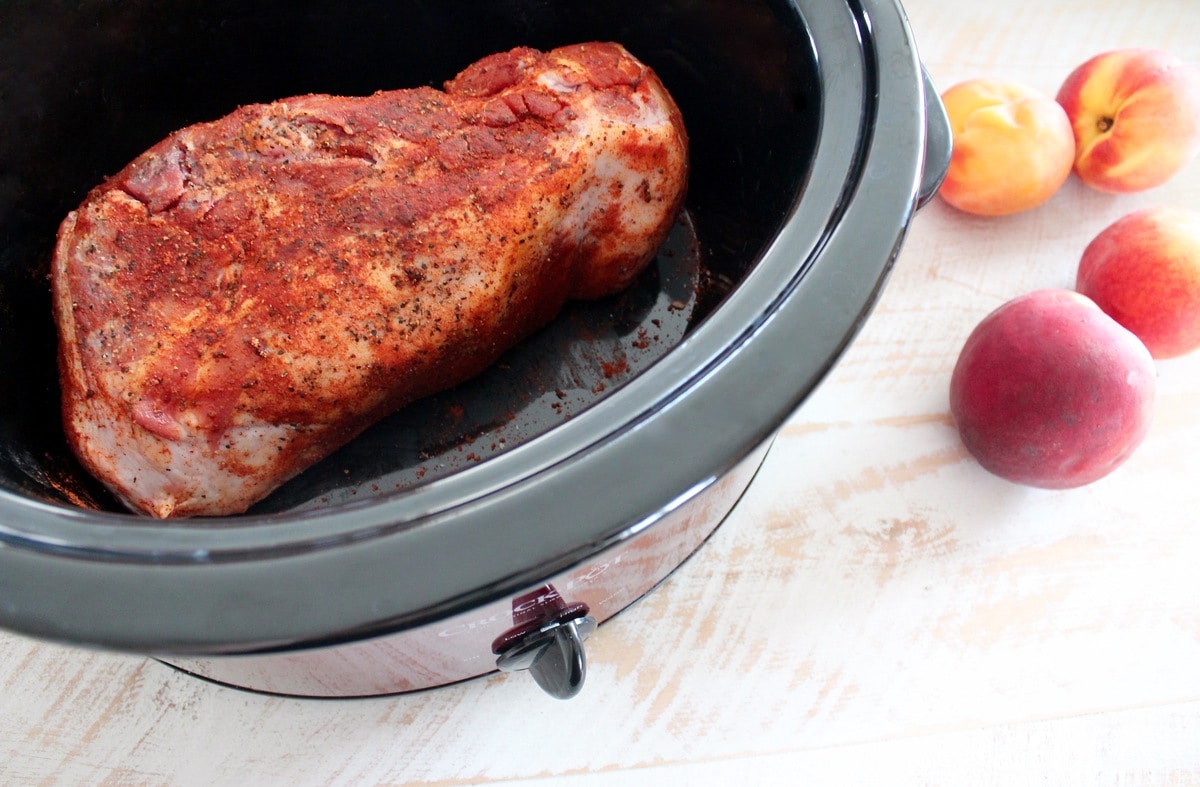 - Add to a slow cooker, cover with the peach bbq sauce.