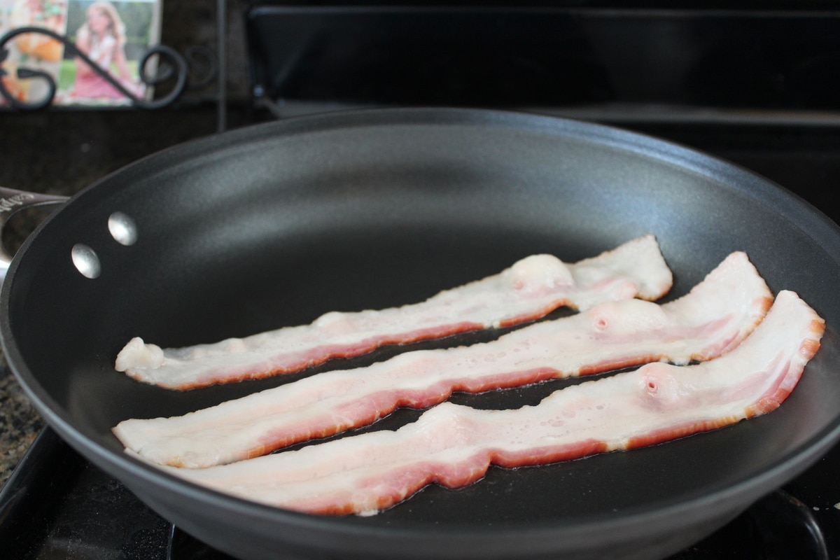 Place a large skillet on the stove over medium-high heat. Add the bacon and cook for 6-8 minutes, then flip (depending on desired level of crispiness.)