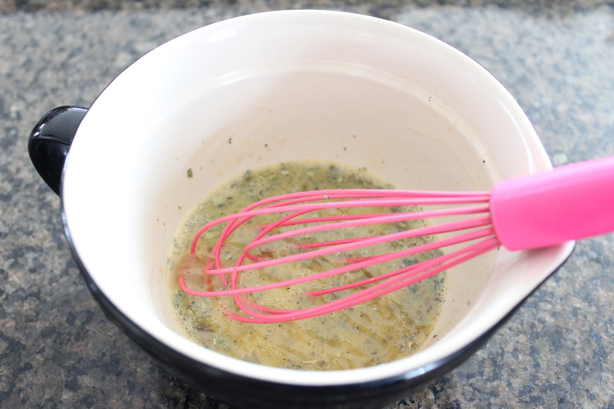 - Add the eggs, milk, oregano, salt and pepper to a mixing bowl and whisk together.