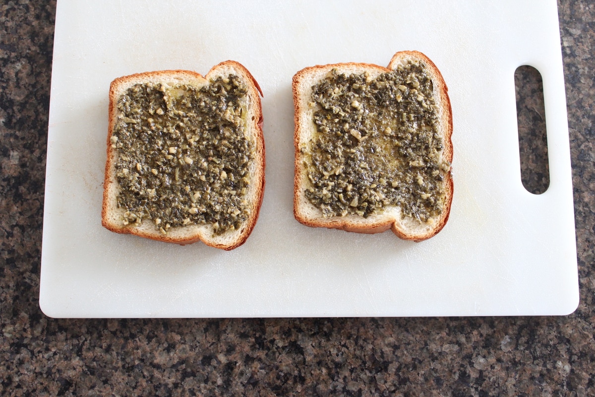 - Top with the remaining slice of toast with pesto.