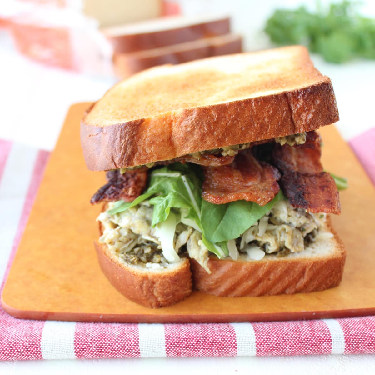 - Break the bacon slices in half, then stack the bacon on top of the pesto on one slice of bread.