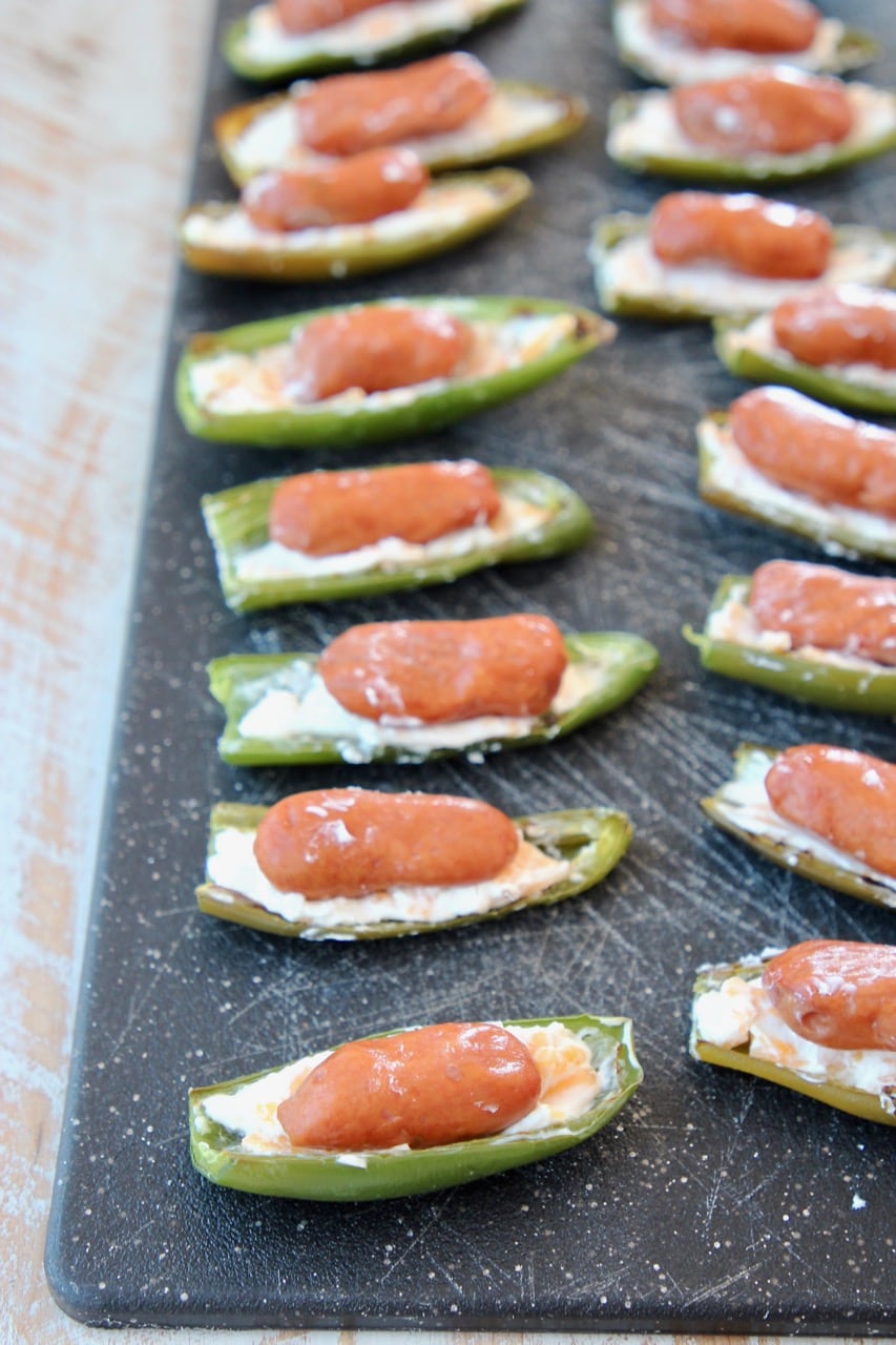 - After removing the jalapenos from the oven, fill each jalapeno half with the cheese mixture and one little smokie.