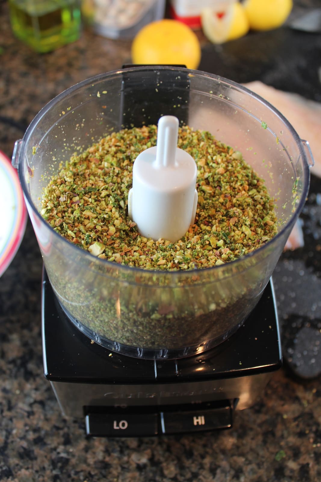 - Place the pistachios and basil into a small food processor and blend.