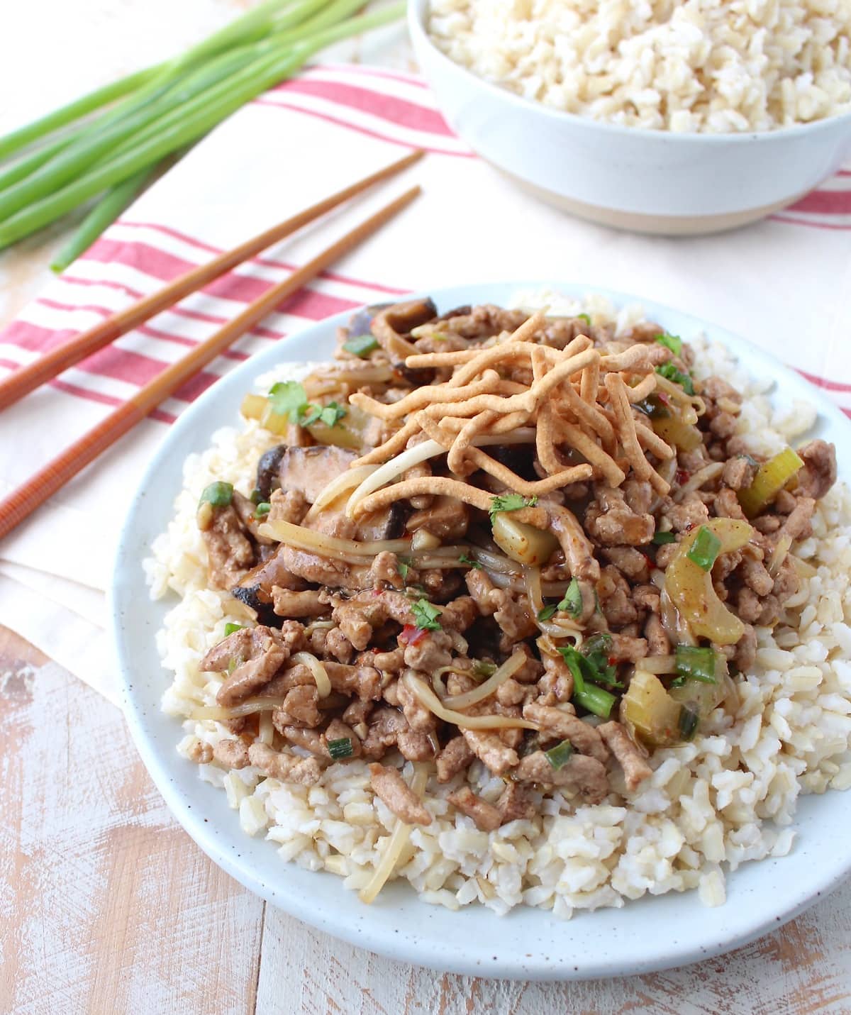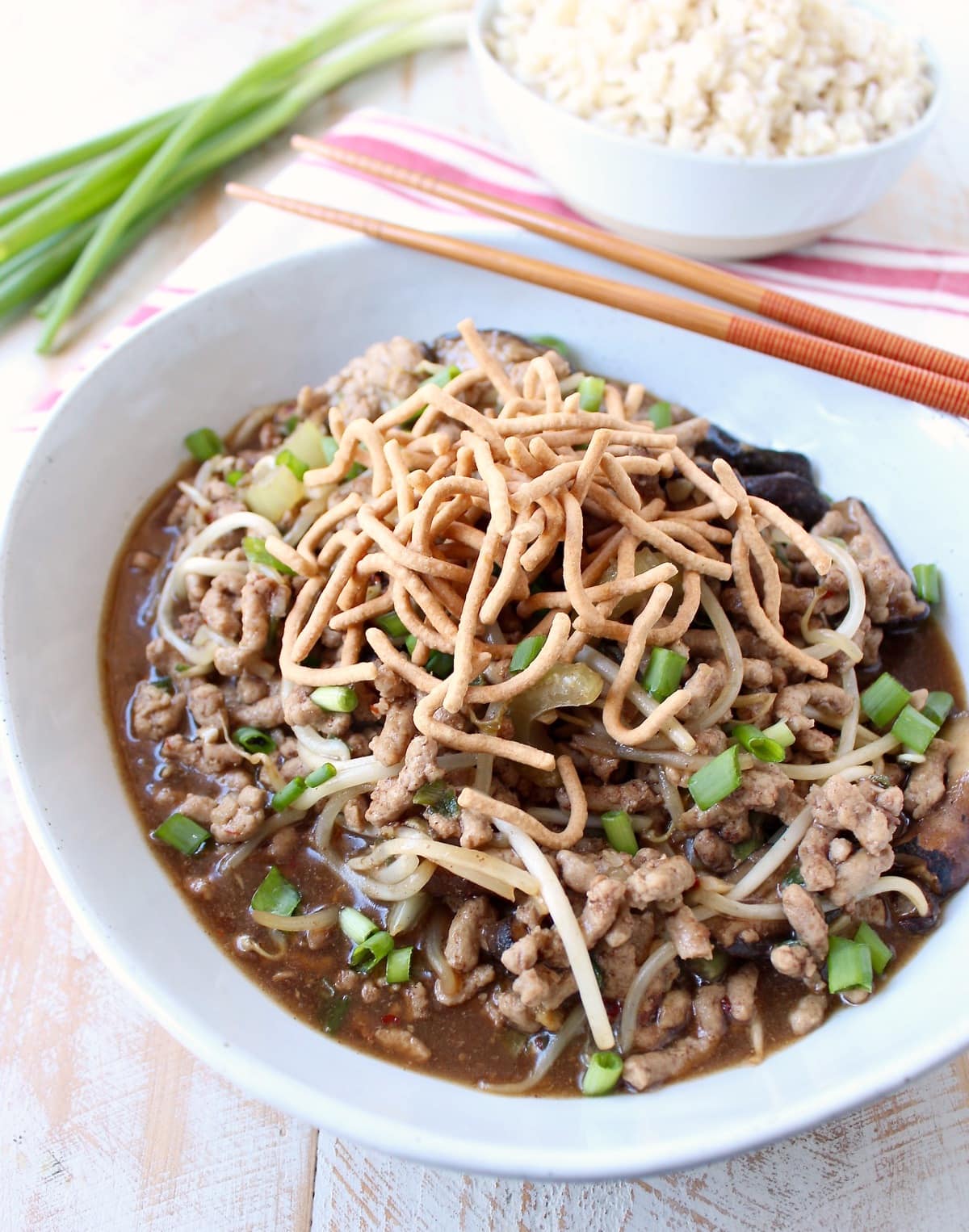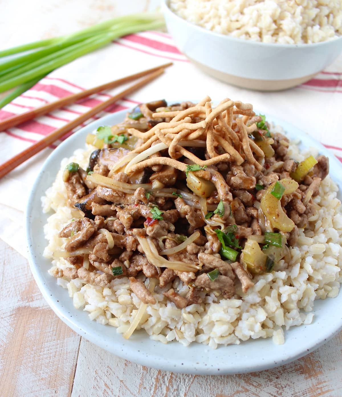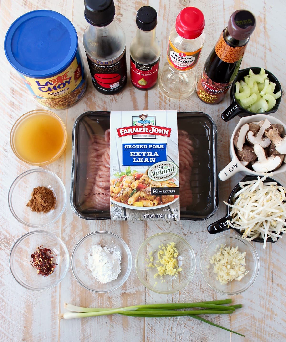 You basically take ground pork, veggies and a really delicious Asian sauce, stir fry it all together, then serve it over cooked rice, and finally, top it with crispy chow mein noodles, Kurt’s favorite part!