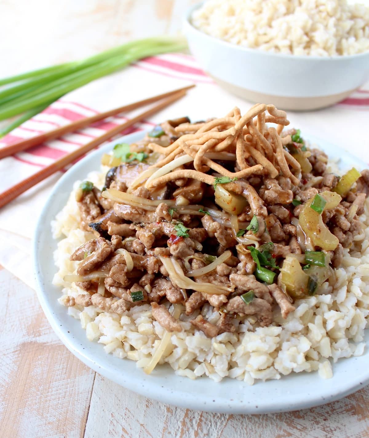 This easy Chinese Pork Chop Suey recipe combines pork, veggies & a delicious Asian sauce, served over white rice, topped with crispy chow mein noodles!
