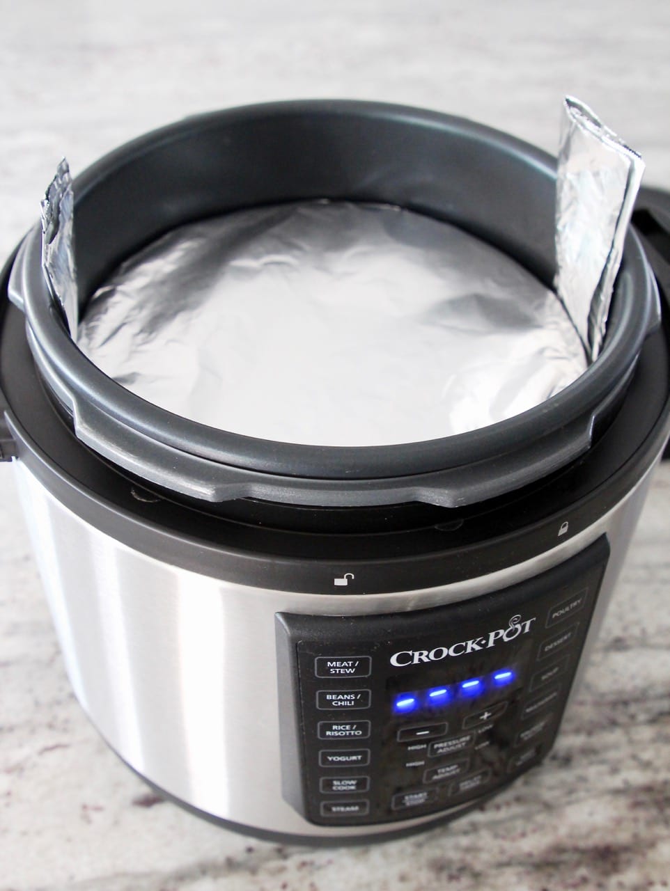 - Grab another long piece of foil and fold it over lengthwise to create a foil sling for lowering the bowl into the Crock-Pot® Express Crock Multi-Cooker