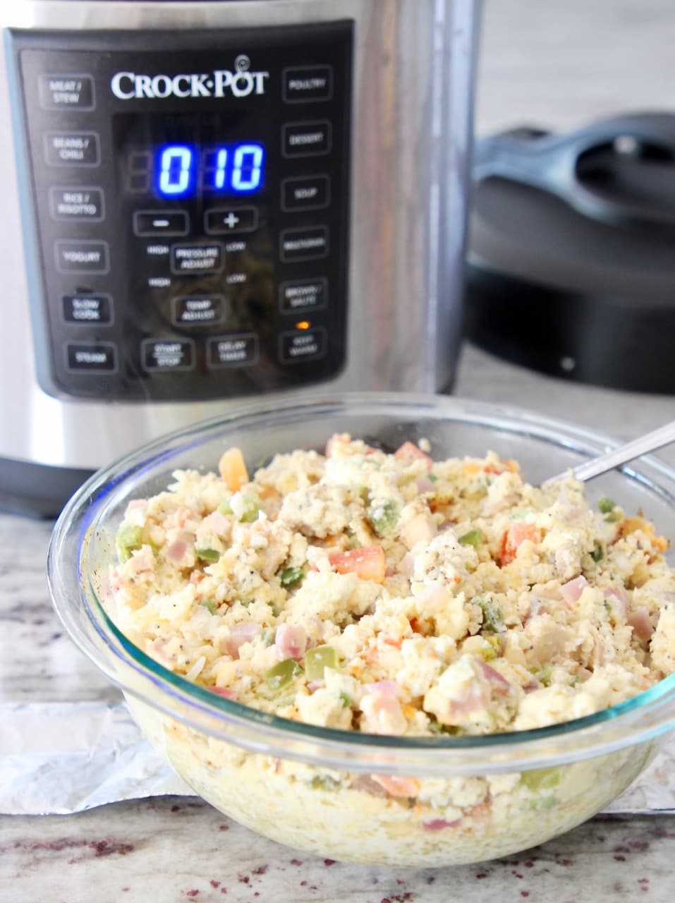 - Mix everything together, sprinkle cheese on top, cover in foil, then use a foil sling to lower the bowl into the Crock-Pot® Express Crock Multi-Cooker.