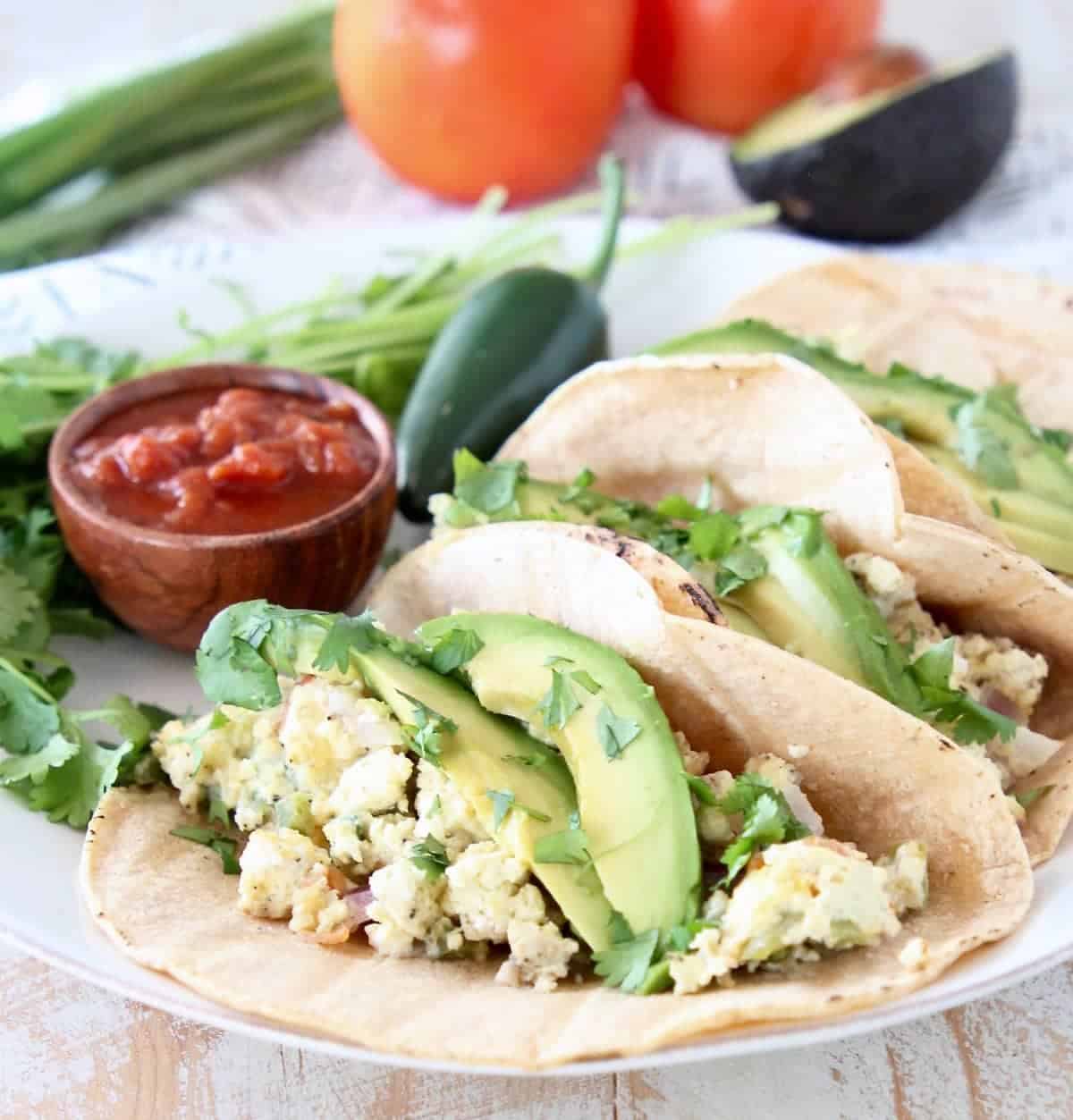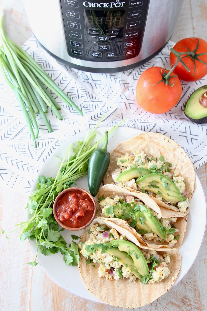 Pressure Cooker Breakfast Tacos are an easy way to make brunch for a crowd, or make ahead for breakfast throughout the week. They can be made with meat, or meatless, for a vegetarian recipe. Serve them in corn tortillas for a delicious gluten free way to start the day!