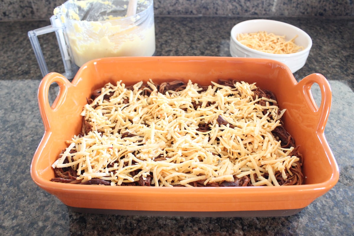 - Top with the pulled pork and 1 ½ cups of cheese.