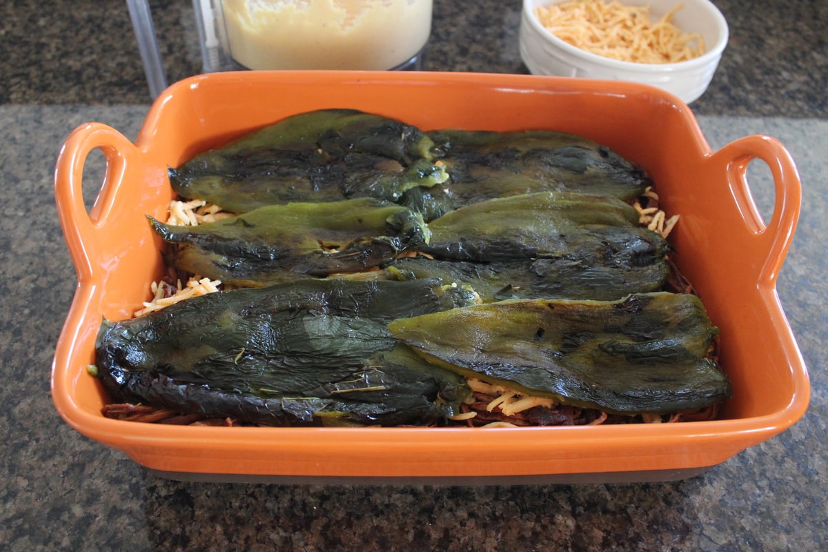 - Layer the roasted poblano peppers on top of the cheese.