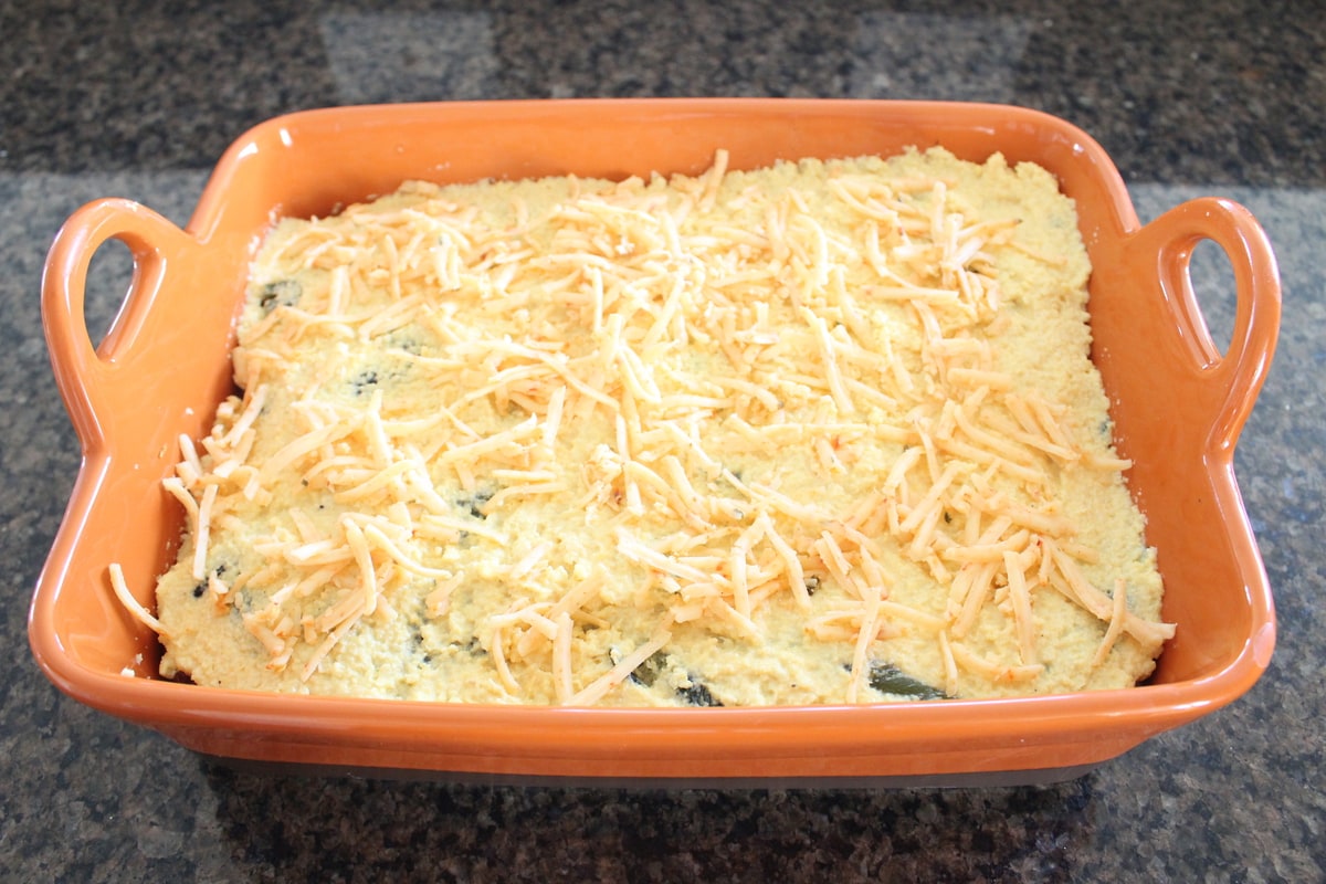 Top the casserole with the remaining corn masa mixture and the remaining cheese.
