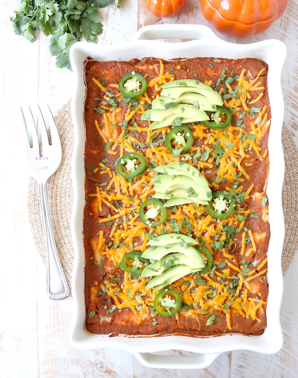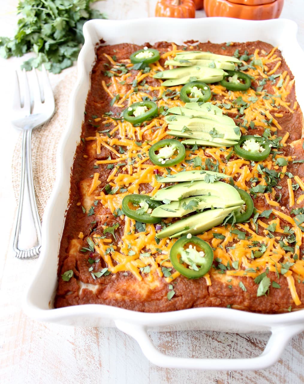 I like a little more spice from the fresh jalapenos and the cool creaminess of fresh avocado and sour cream! No matter what you top it with, you can’t go wrong with these Pumpkin Enchiladas for a fun fall meal!