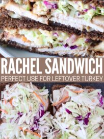If you enjoy a classic Reuben, you’re really going to love the Rachel Sandwich! This delicious twist swaps corned beef for juicy sliced turkey, then piles it high with coleslaw, melty Swiss cheese, and plenty of Thousand Island dressing. Toasted on rye bread until golden and gooey, this turkey Reuben is the kind of easy, flavor-packed recipe that turns an ordinary lunch into something crave-worthy. Perfect for using up leftover turkey after Thanksgiving!