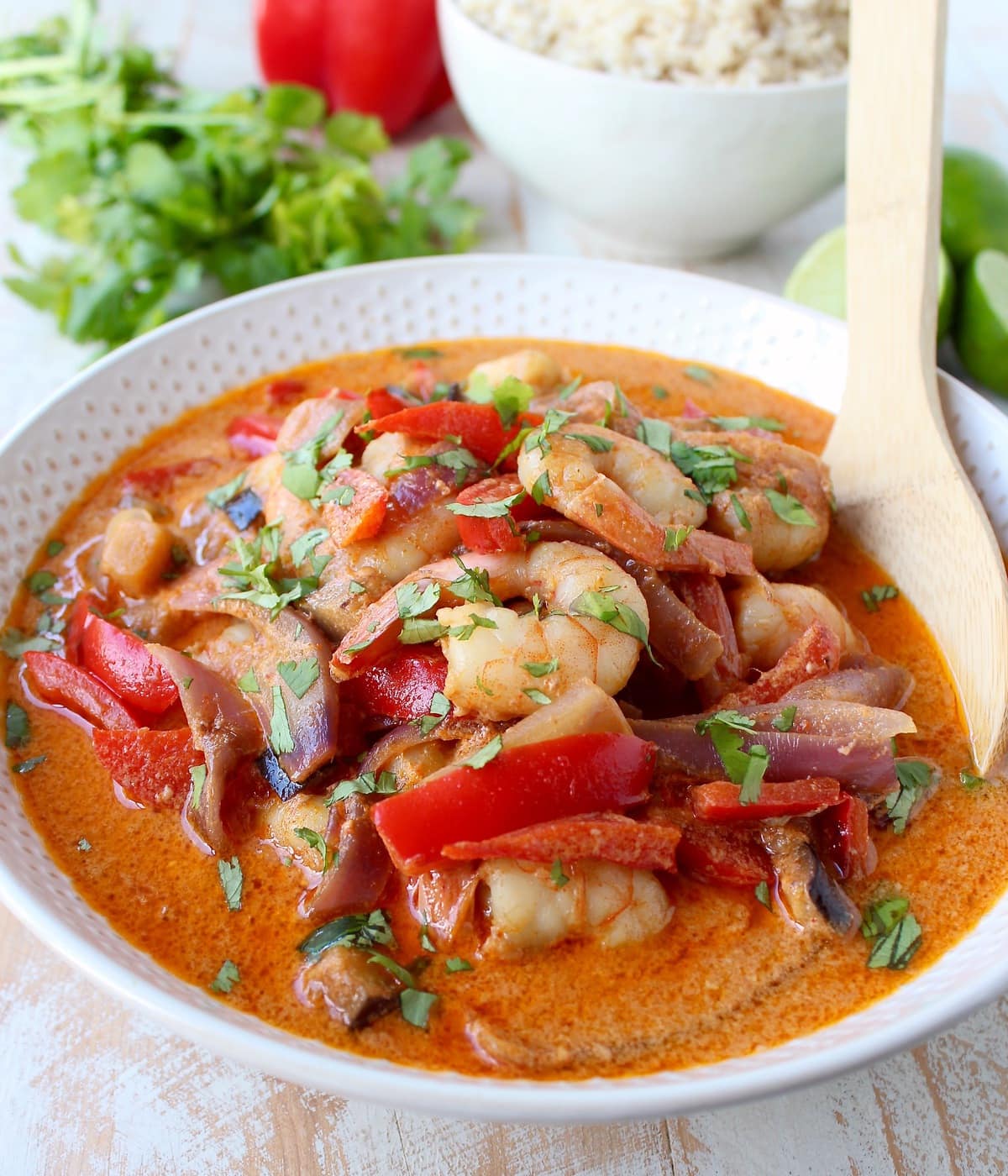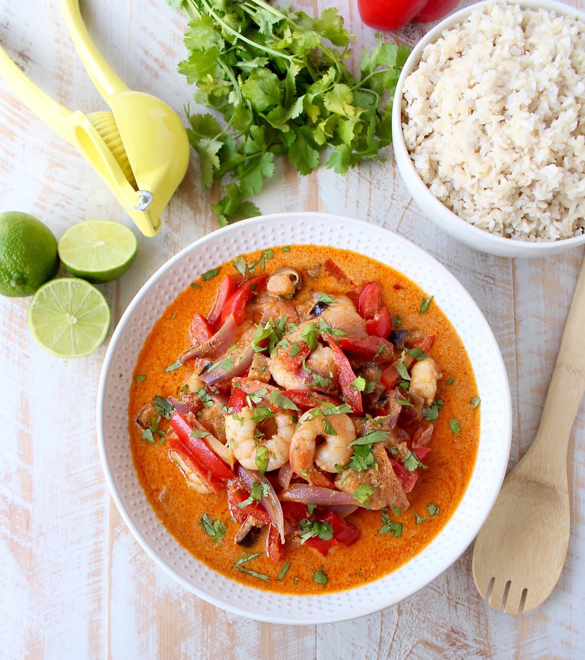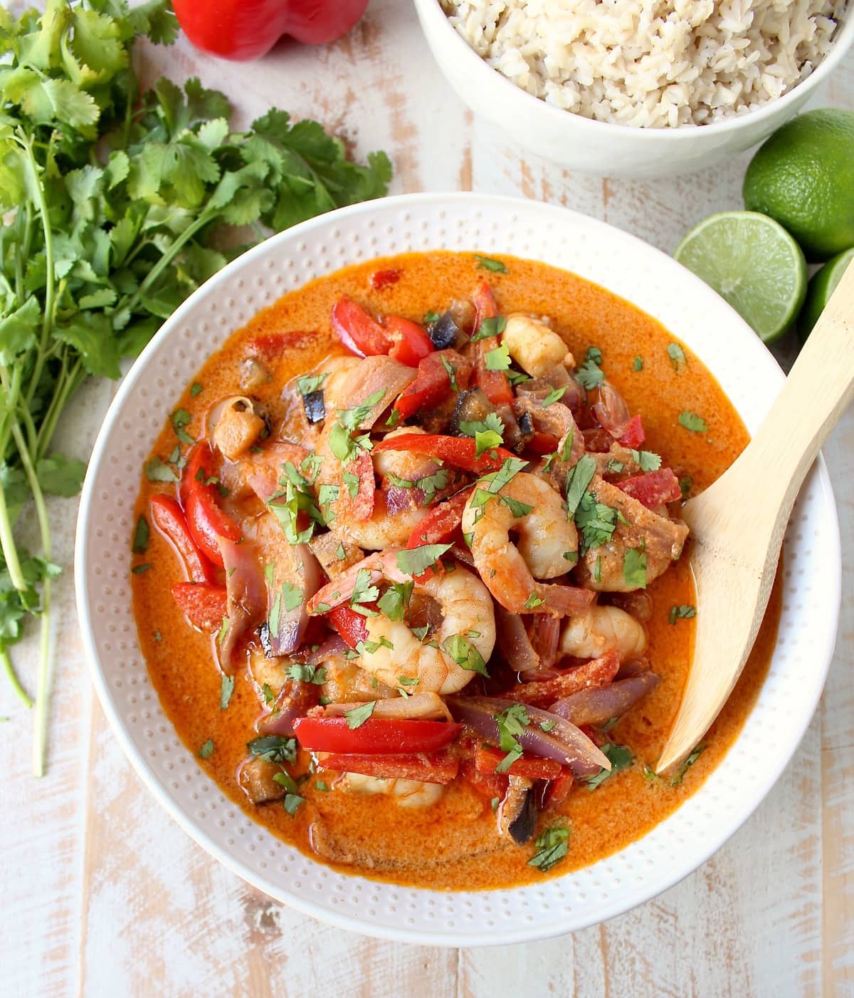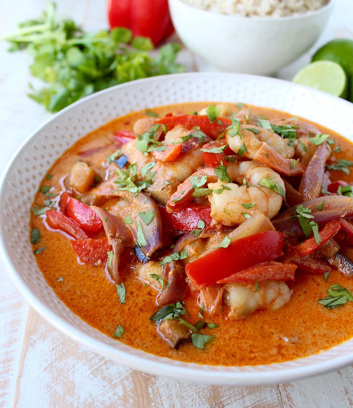 Over the years, I’ve made several of my Thai delivery favorites at home, like Drunken Noodles, Spicy Vegetable Pad Thai and Thai Roti Bread. And today, I’m introducing my latest “Thai at home” recipe creation, Red Curry Shrimp.