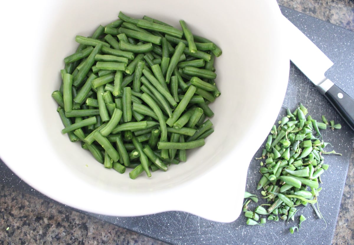 - Trim the ends off the green beans, chop into 1 inch pieces and add them to a large mixing bowl.