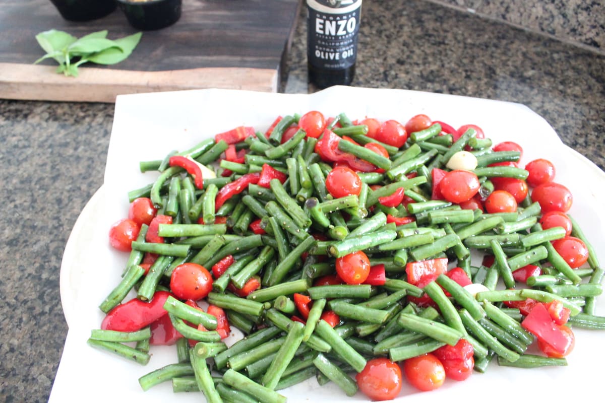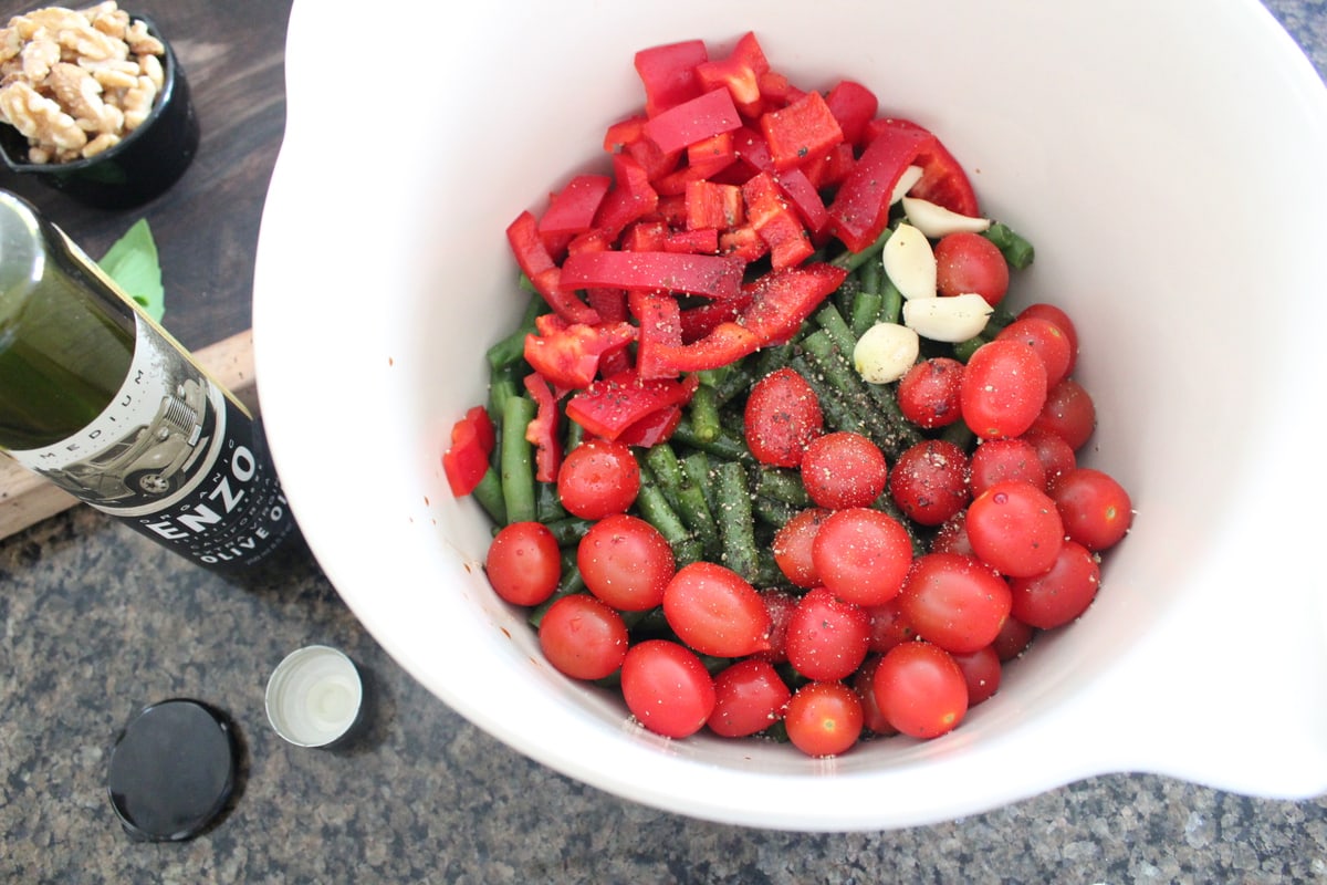 - Add the tomatoes, bell peppers and garlic cloves to the bowl then drizzle with the balsamic vinegar, olive oil and top with the black pepper.