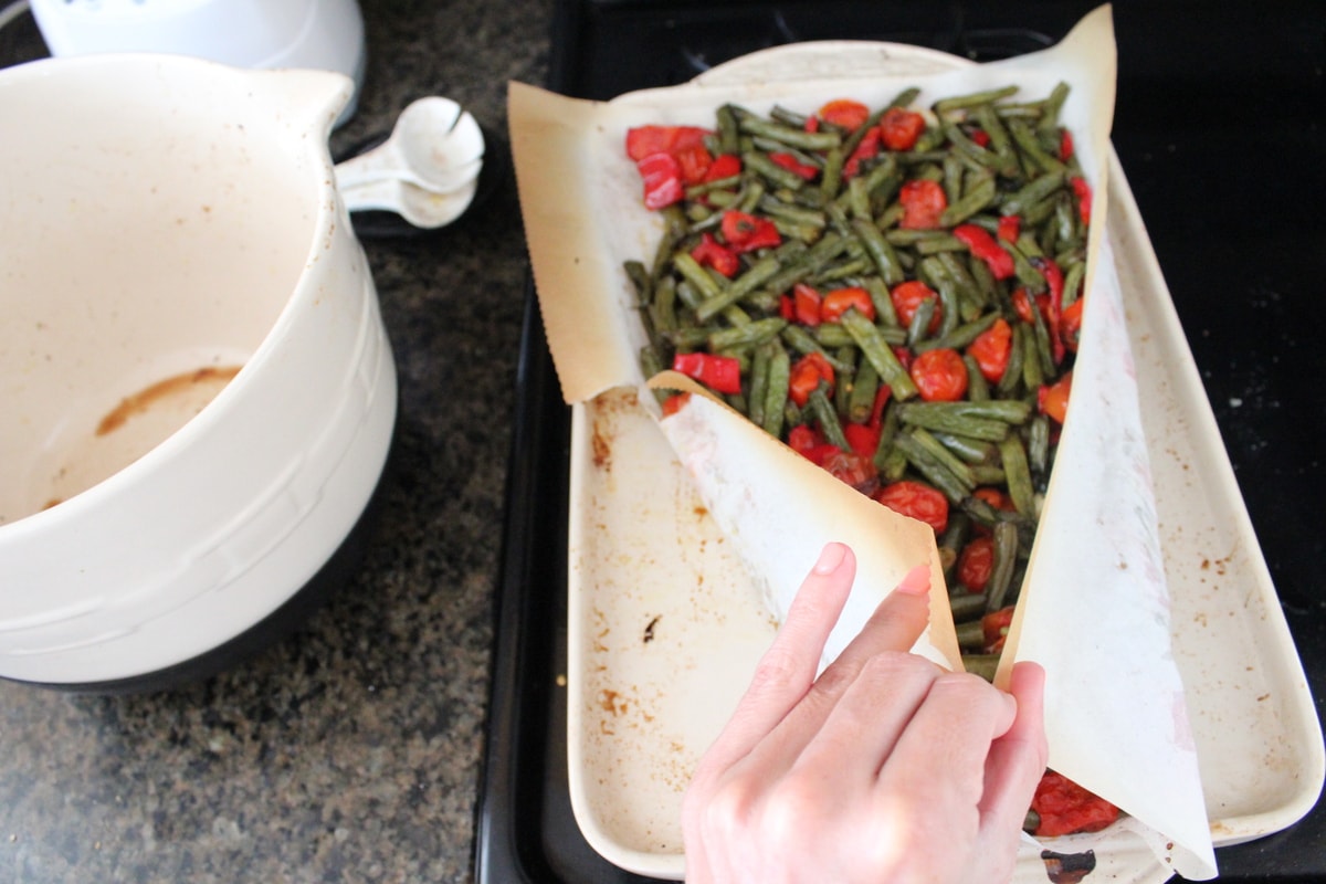 My recommendation: grab the sides of the parchment paper or foil (like this ↓) and simply slide it into the bowl so you make sure to get all the roasted vegetables and the delicious balsamic juices into the bowl.