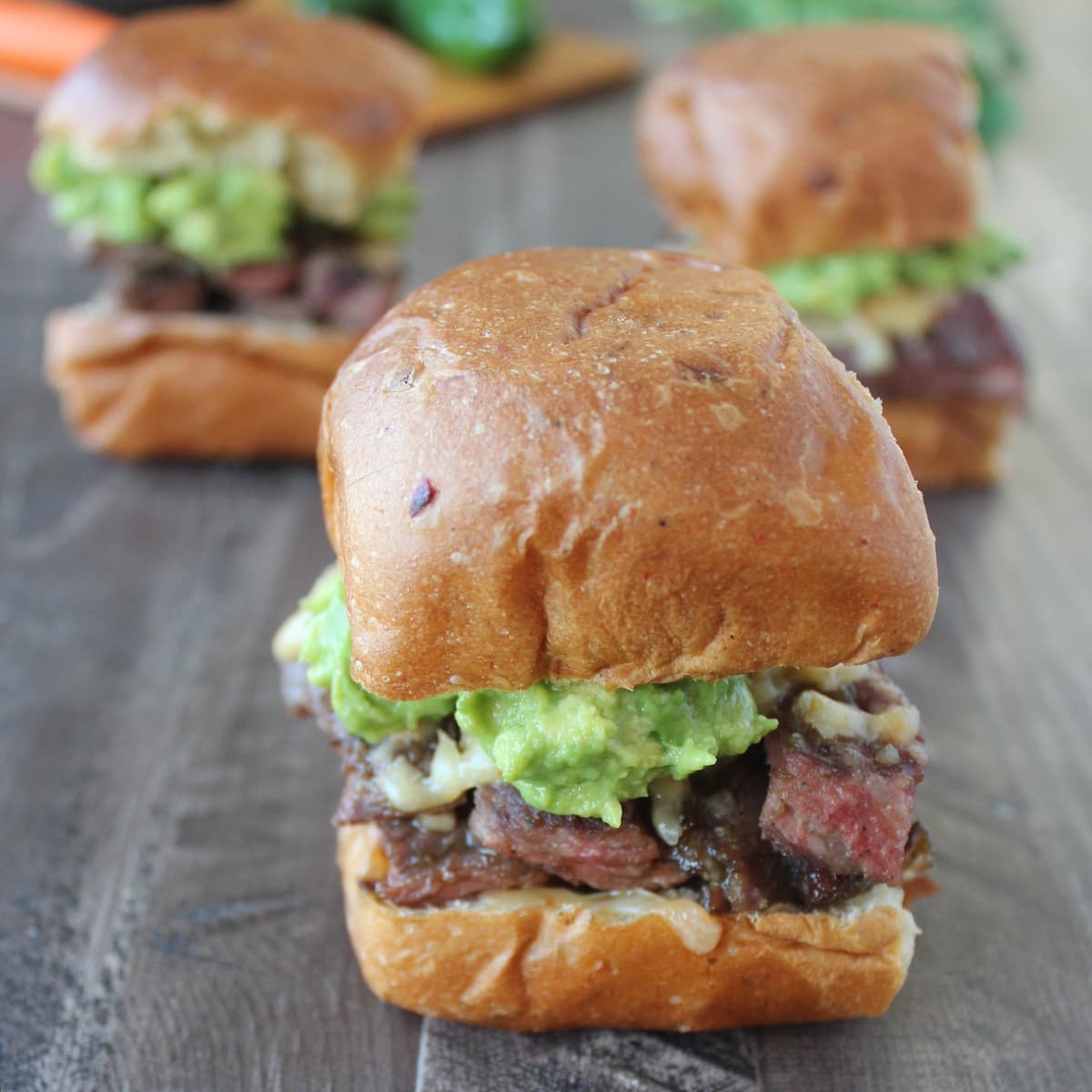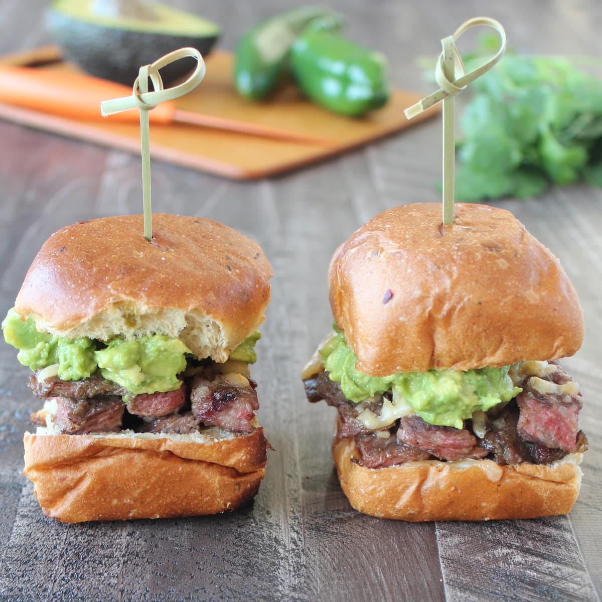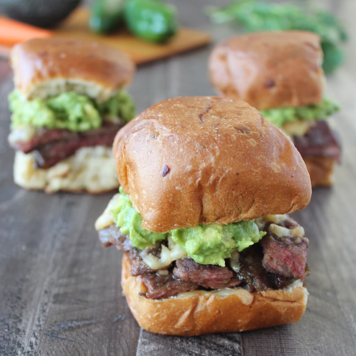 Roasted jalapeños & honey make a delicious marinade in this simple recipe for Carne Asada Sliders, topped with spicy cheddar cheese & guacamole!