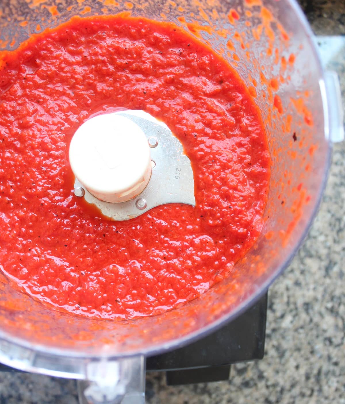 - Add the red peppers to a food processor or blender and puree, set aside.