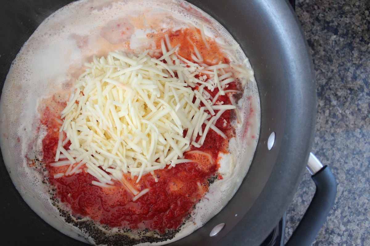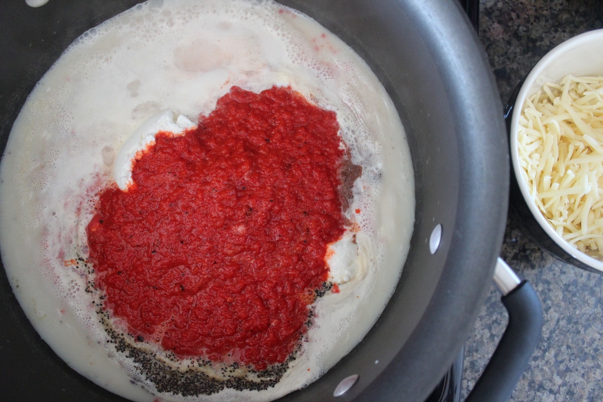 - Reduce the heat to medium, mix in the roasted red pepper puree, ricotta cheese, nutmeg, salt and pepper.