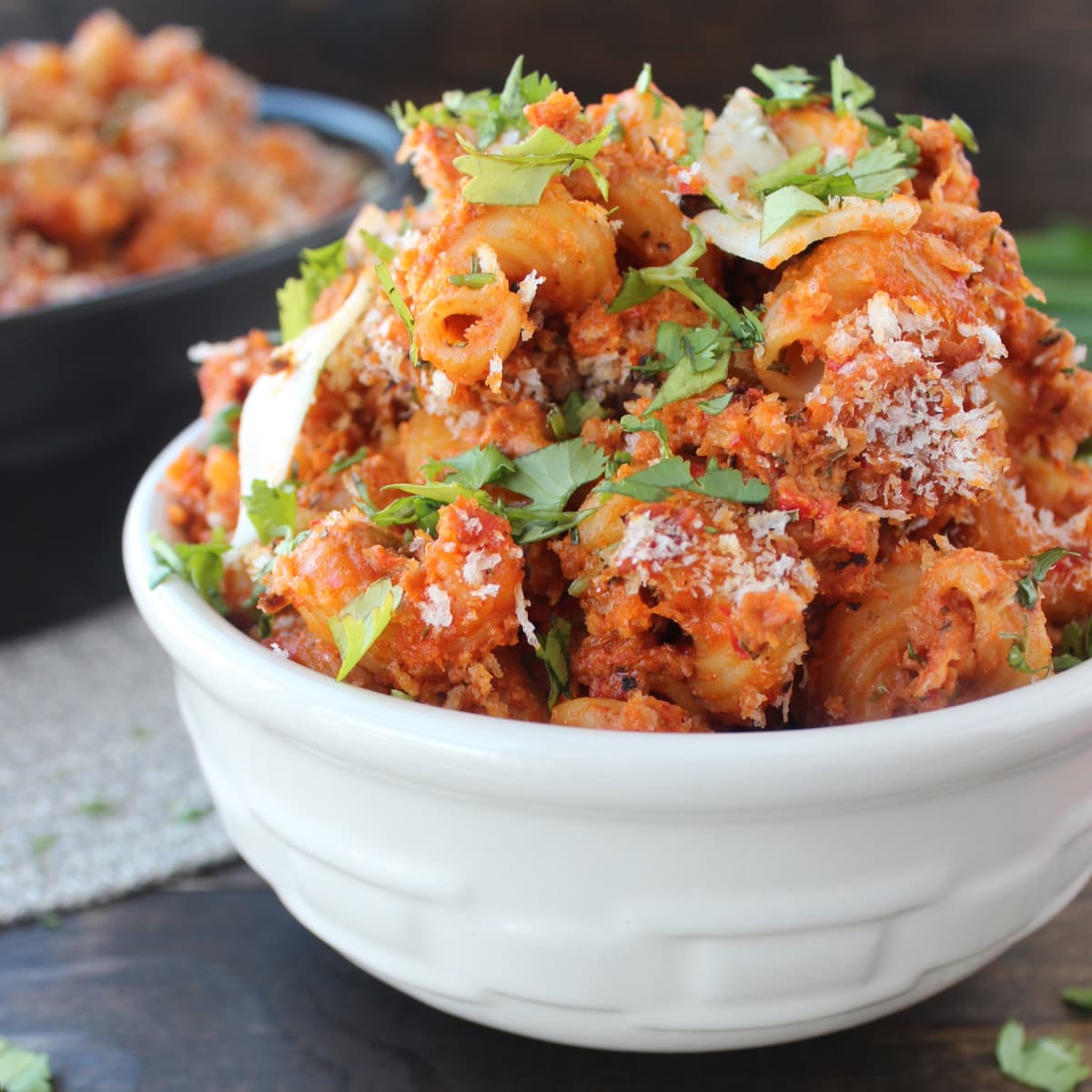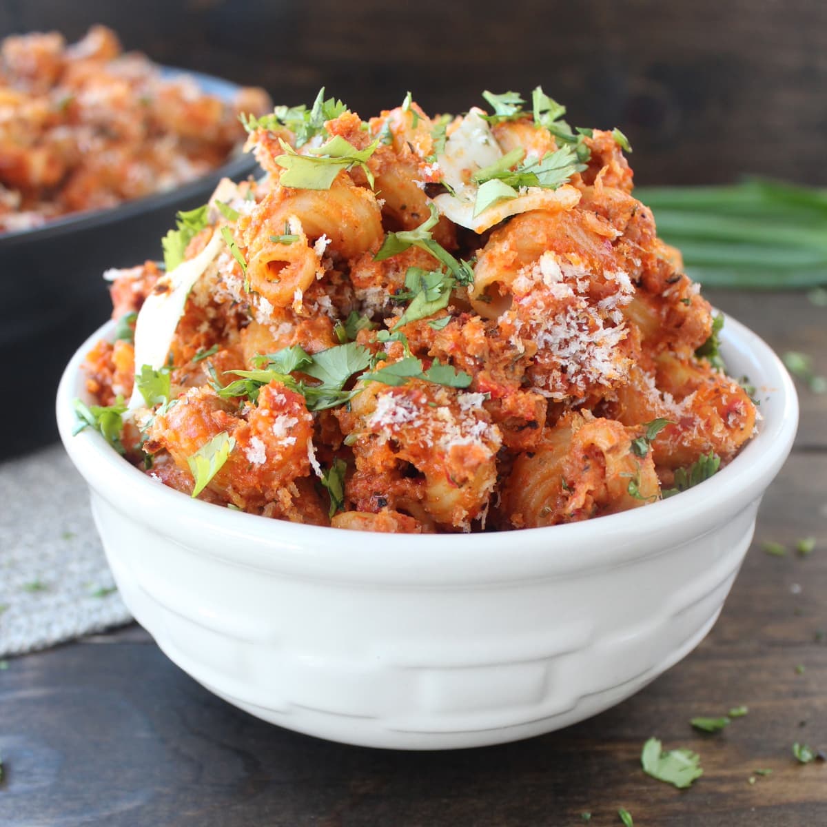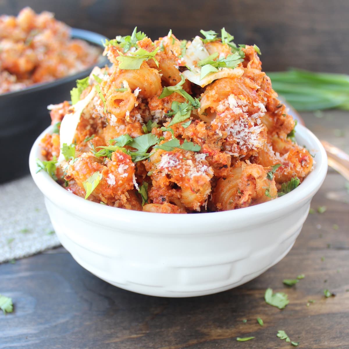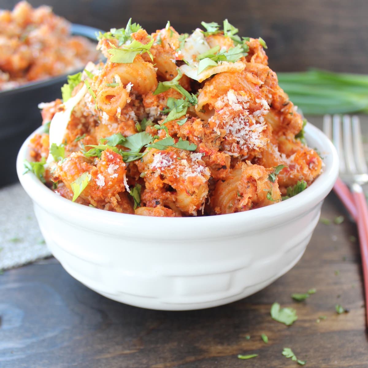 The roasted red peppers add a ton of flavor to the creamy, cheesy sauce, while the chorizo adds a nice little kick to the dish!