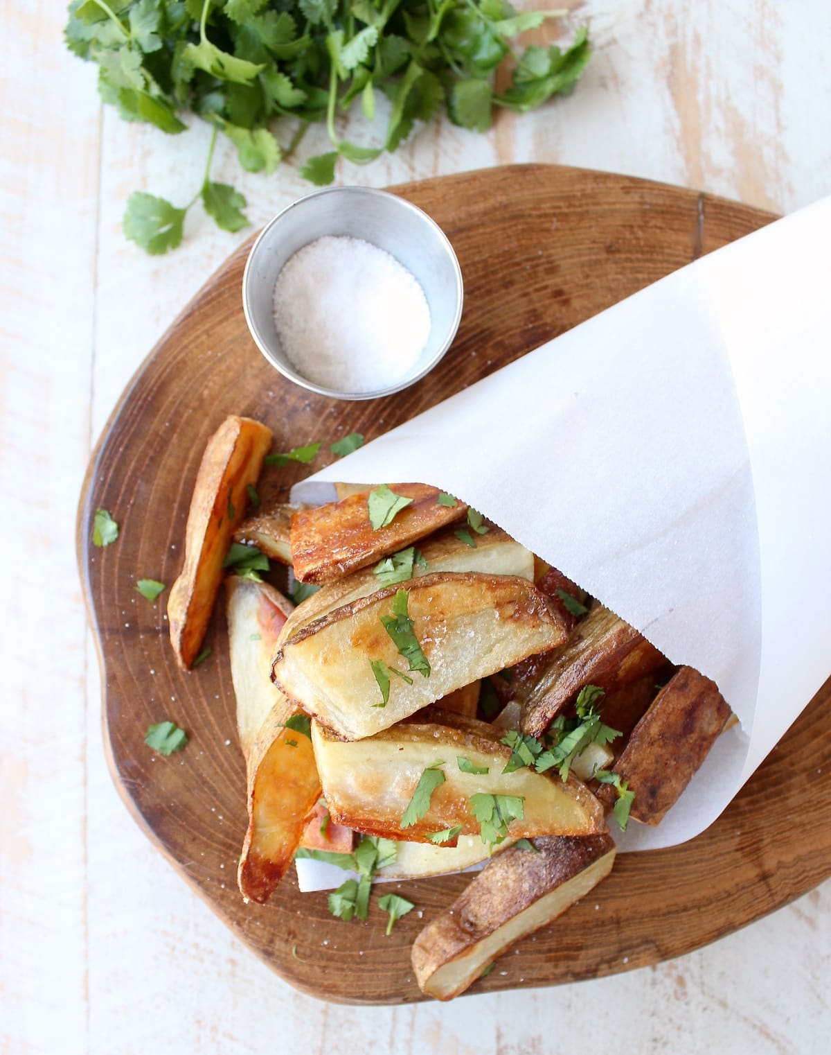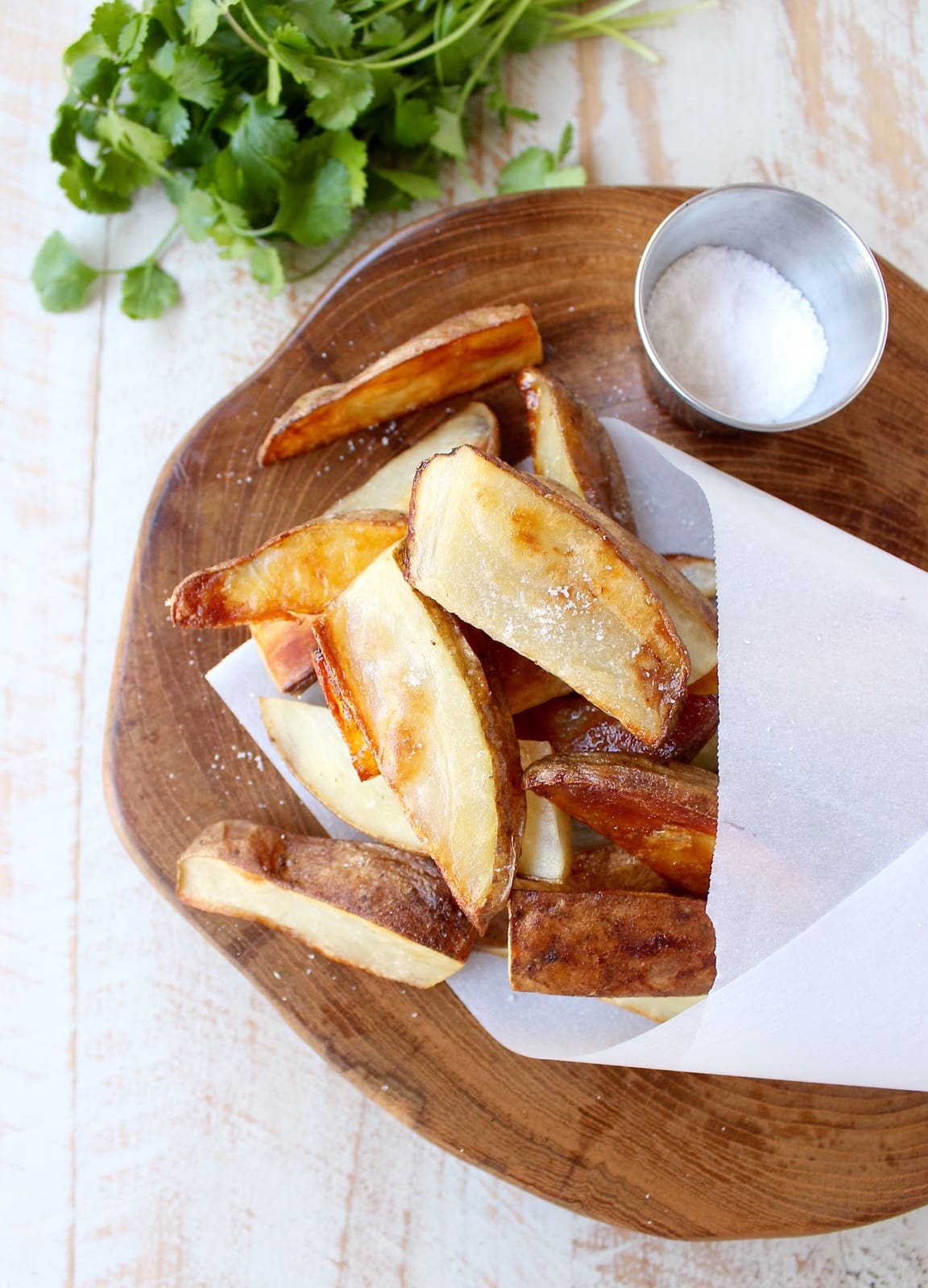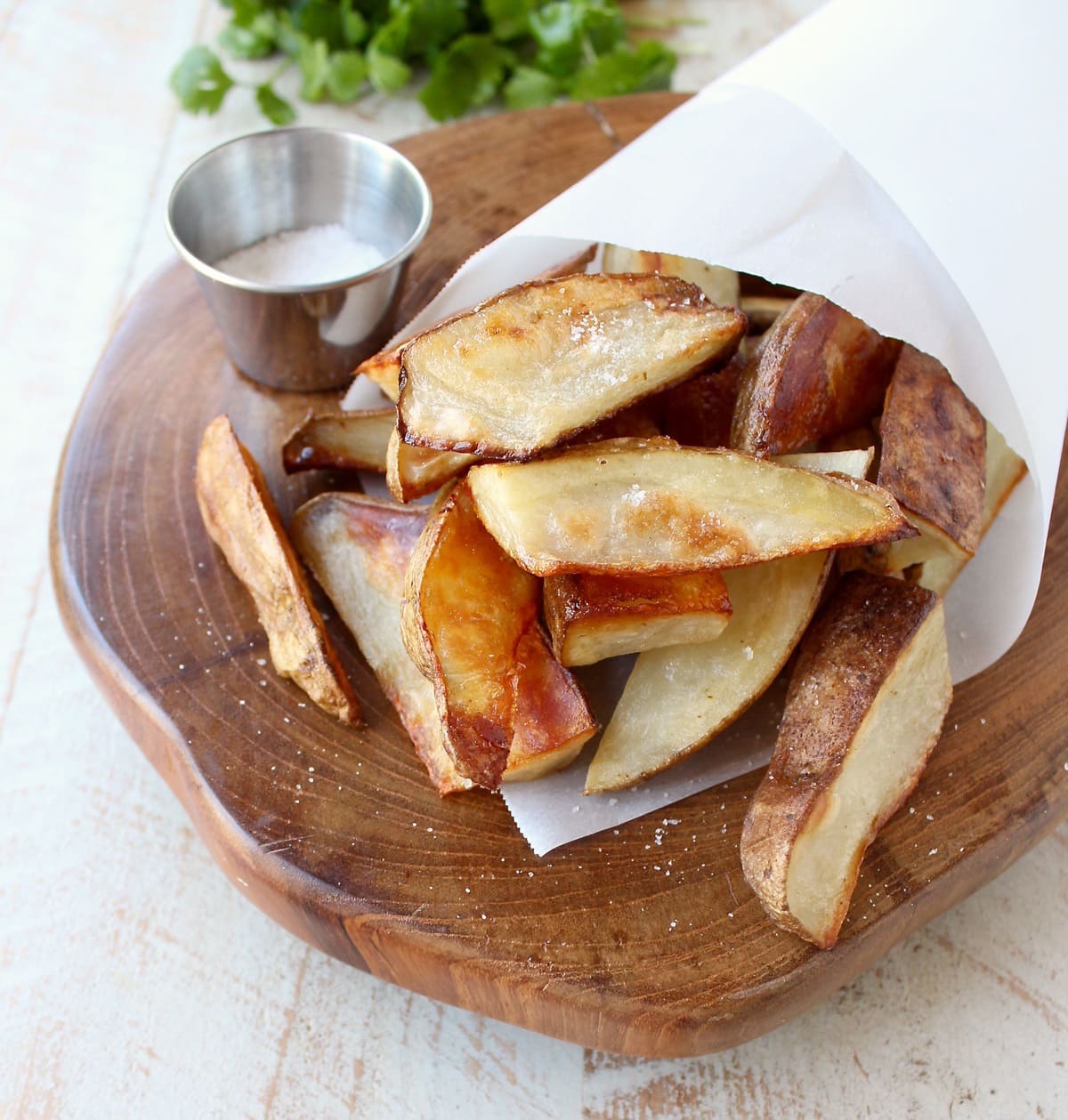 I got to thinking about those variations on salt and vinegar potatoes and decided to go with oven roasted potato wedges. They’re easy, delicious and the perfect combination of crispy and salty!