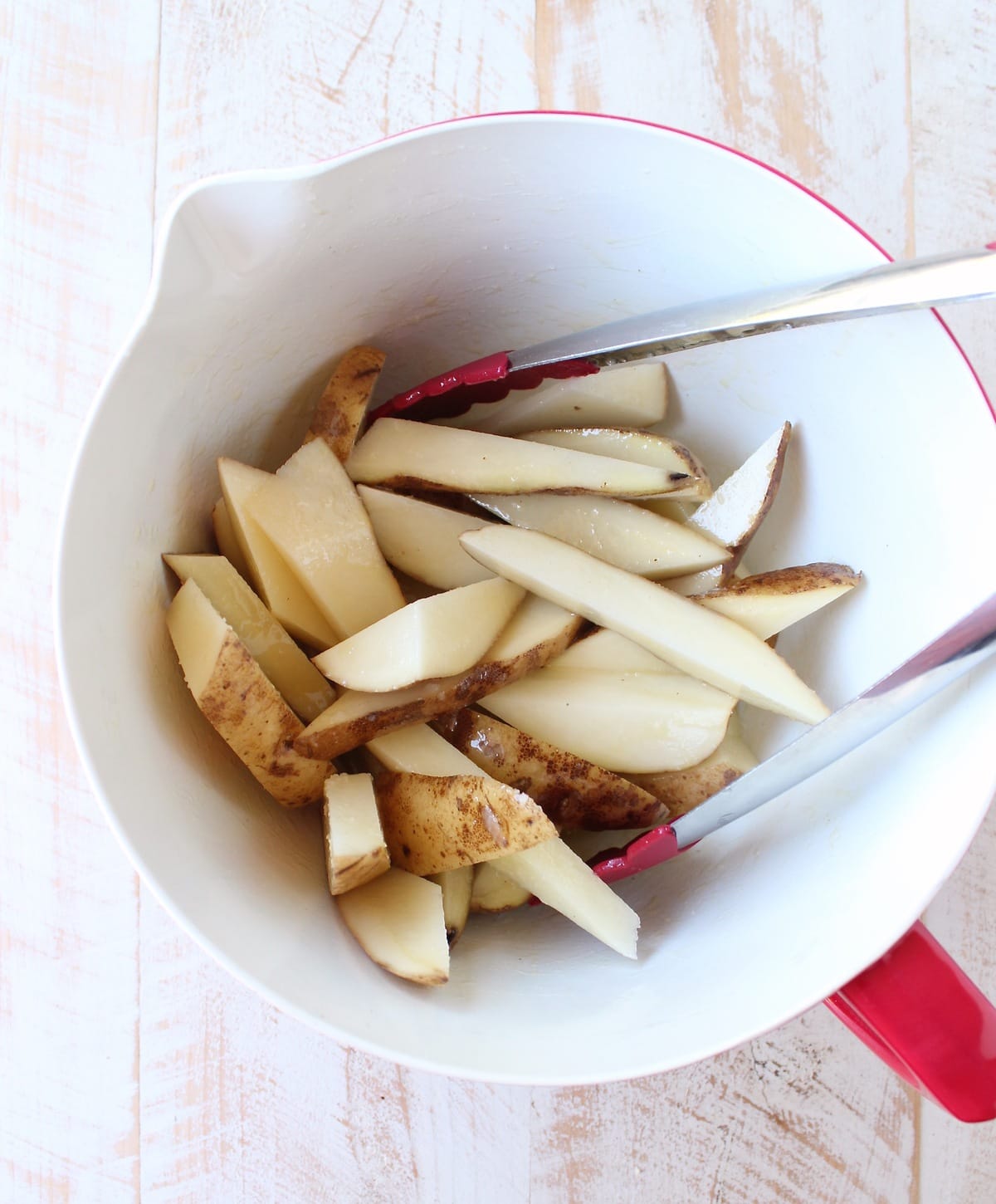 - Add the potatoes to a mixing bowl and combine with the olive oil, kosher salt and vinegar.