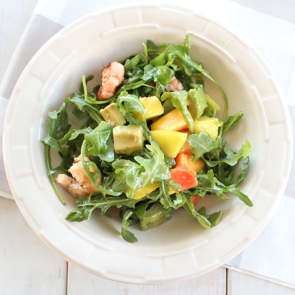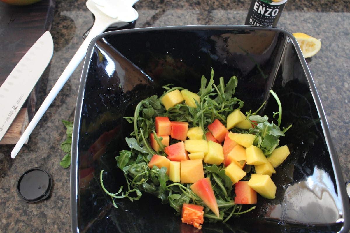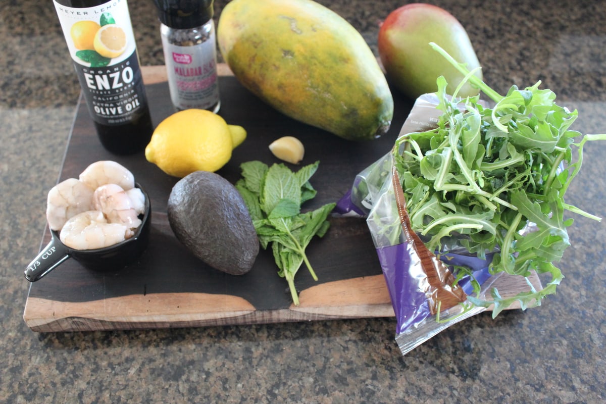 - Grill the shrimp for 2-3 minutes per side, then prepare the salad by adding the arugula, mango, papaya and avocado to a large bowl.