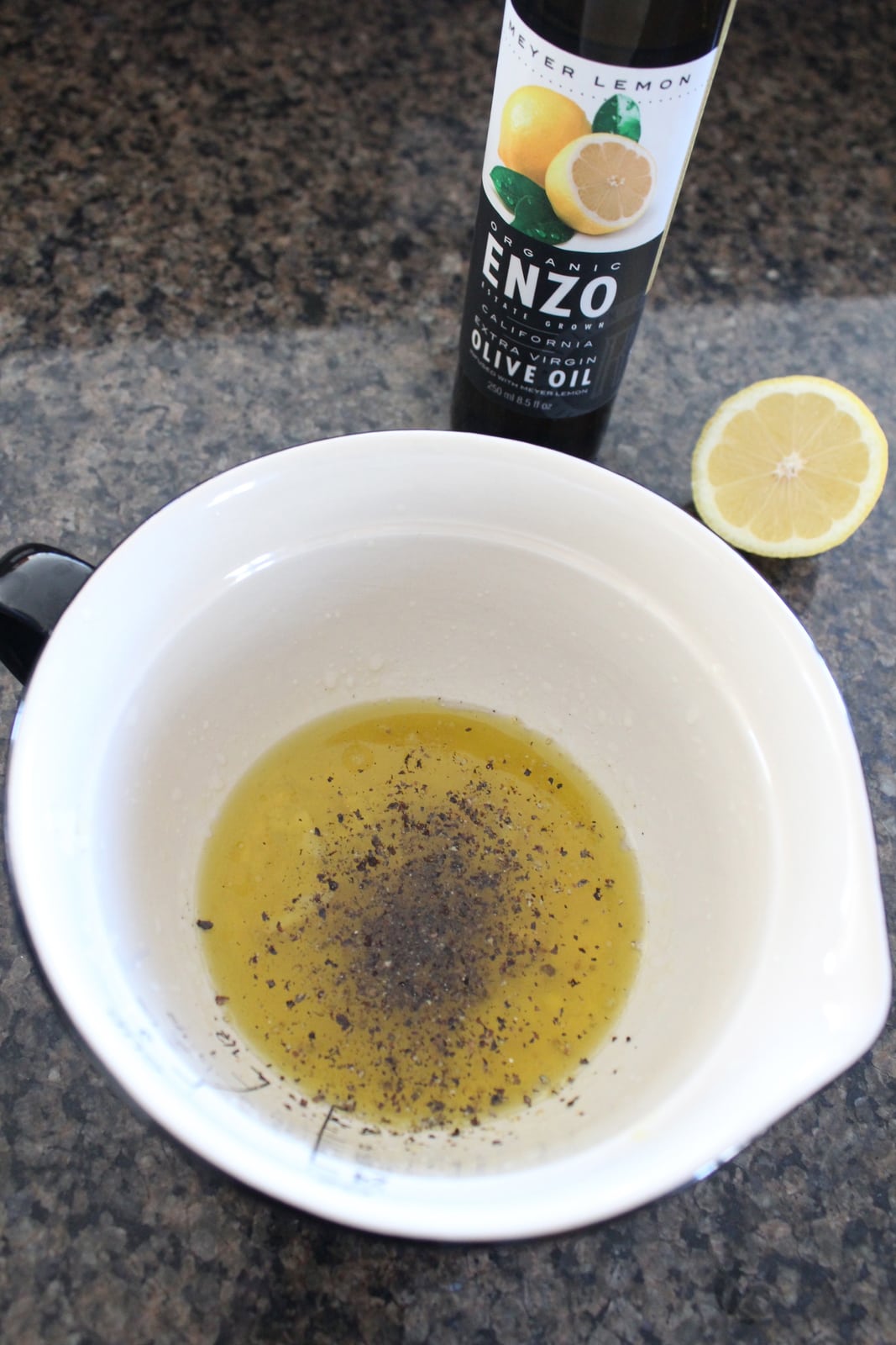 - Prepare the marinade for the shrimp by combining the olive oil, lemon juice, garlic and black pepper.